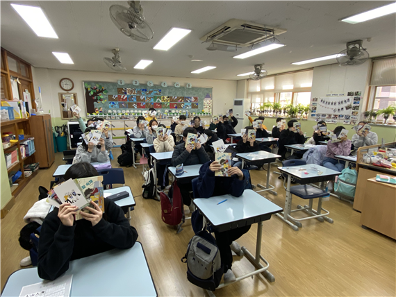 김다노 작가님과 함께한 교실 라이브! 교실에서 실제로 만나는 것이 아님에도 두근두근 설레는 마음으로 참여했다. 작가님이 다양한 이야기를 알차게 준비해 주신 덕분에 책에서 발견하지 못한 부분을 다시 확인하기 위해 책을 펼쳐 보는 아이들의 모습을 발견할 수 있었다. 작가님의 경험을 바탕으로 한 차별 이야기가 인상 깊었다. 아이들이 ‘이랑이가 여자인가요?’ 하는 질문을 많이 했는데, 이 질문에 대해 작가님은 어느 강연에서 머리 긴 학생을 보고 무의식적으로 ‘여자’라고 생각했는데 알고 보니 남학생이어서 반성했다는 일화를 들려 주셨다. 정말 머릿속이 띵! 하는 순간이었다. 50분이라는 시간이 짧게 느껴질 정도로 흥미로운 교실 라이브에서 아이들의 반응이 가장 폭발적이었던 순간은 바로 우리 반과 신풍초 친구들의 질문이 선정되어 나왔을 때다. 작가님이 우리가 쓴 질문에 답해 주시다니! 쉽게 하지 못할 경험이었다!
