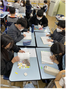 ‘비밀 숙제’는 한 챕터의 분량이 많지 않아서 한 차시에 한두 챕터를 함께 읽었다. 친구들과 돌아가며 한 장씩 소리 내어 읽고, 한 챕터가 끝날 때마다 함께 생각해 볼 이야기나 감상을 나누었다.