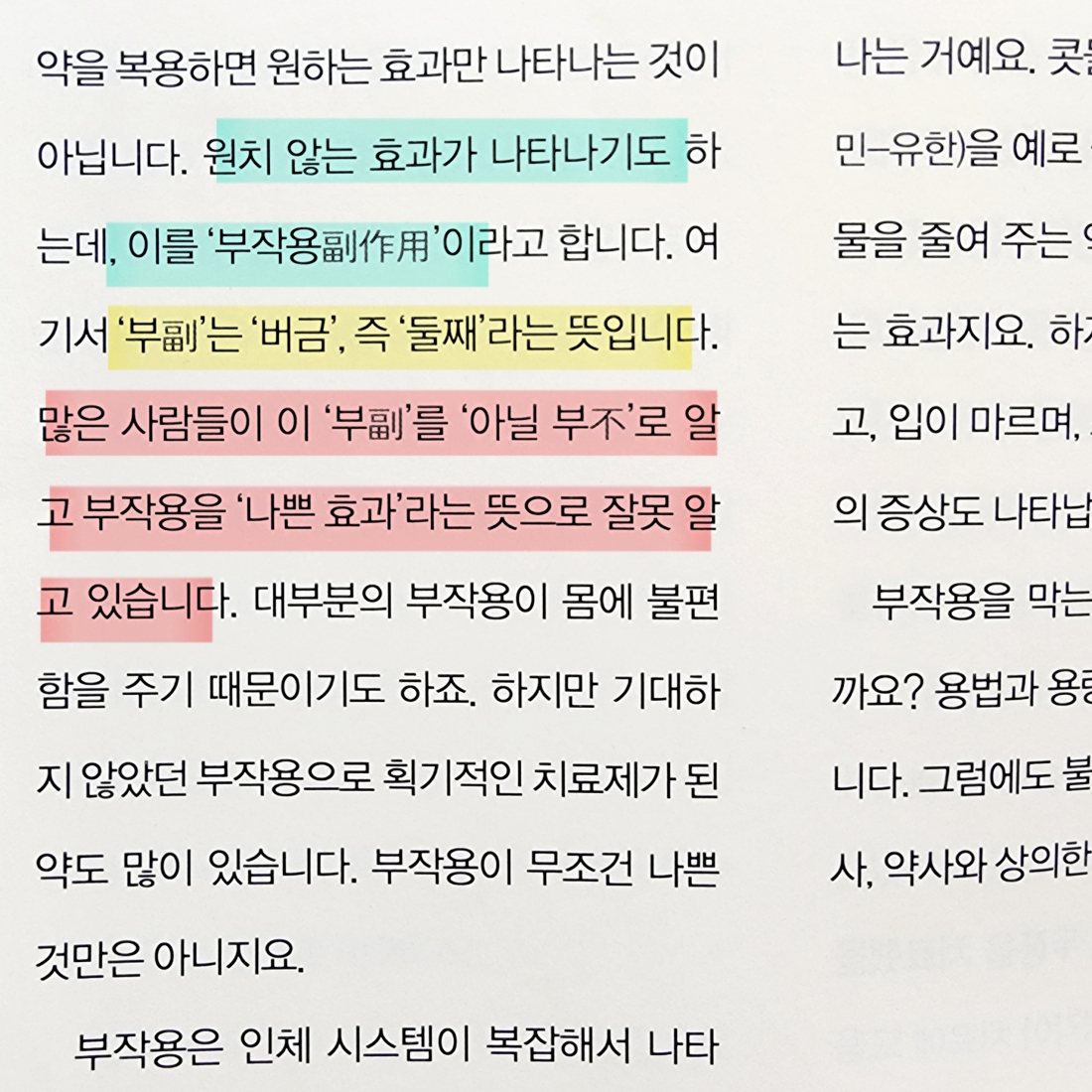 그리고 한자어가 많은 우리나라의 말 특성상 위(거짓 僞)약(약 藥) 이나, 부작용(副作用)과 같은 한자를 표기해줌으로써 단어를 유추하거나 이해할 수 있도록 도와주는 부분도 좋았다. 부작용의 ‘부’가 ‘둘째’라는 뜻의 副이며, ‘아닐 不’가 아니라는 사실이 새로웠다.