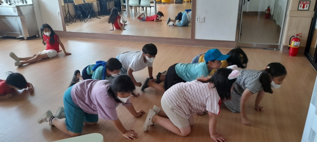가장 먼저 개구리가 나왔다. “그럼 우리가 만난 개구리처럼 걸어 볼까?” 그러자 모두 개구리처럼 펄쩍 뛰면서 움직였다. 그렇게 잠시 개구리처럼 뛰어다니다가 또 다른 친구에게 물어보았다. “넌 누구를 만났니?” 그 친구는 우렁이를 만났다고 했다. “그럼 우렁이 알처럼 가 볼까?” 모두 바닥에 엎드려서 꿈틀댔다. 어떤 아이는 책상 다리에 붙어서 꿈틀거렸다. 이후에도 투구새우, 달팽이, 올챙이, 개미, 꿀벌, 거미 등 다양한 생명들이 나왔다.