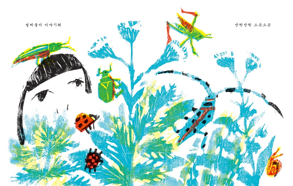 파란 책싸개가 시원하다. 환한 햇살 아래에 있는 듯 웃는 아이의 모습이 금빛으로 물들어 있다. 그런 아이 때문일까? 그림에 해가 없는데 눈이 부시다. 파란 종이를 살짝 들추어 보면 단단한 파란색 책 표지에 무당벌레가 날아오르고 있다. 표지를 넘기면 진짜 눈부시게 환한 노란색이 펼쳐진다. 그냥 넘어갈 수 없는 색이다. 이 색들을 보면 무엇이 떠오르는지 이야기를 나눴다.