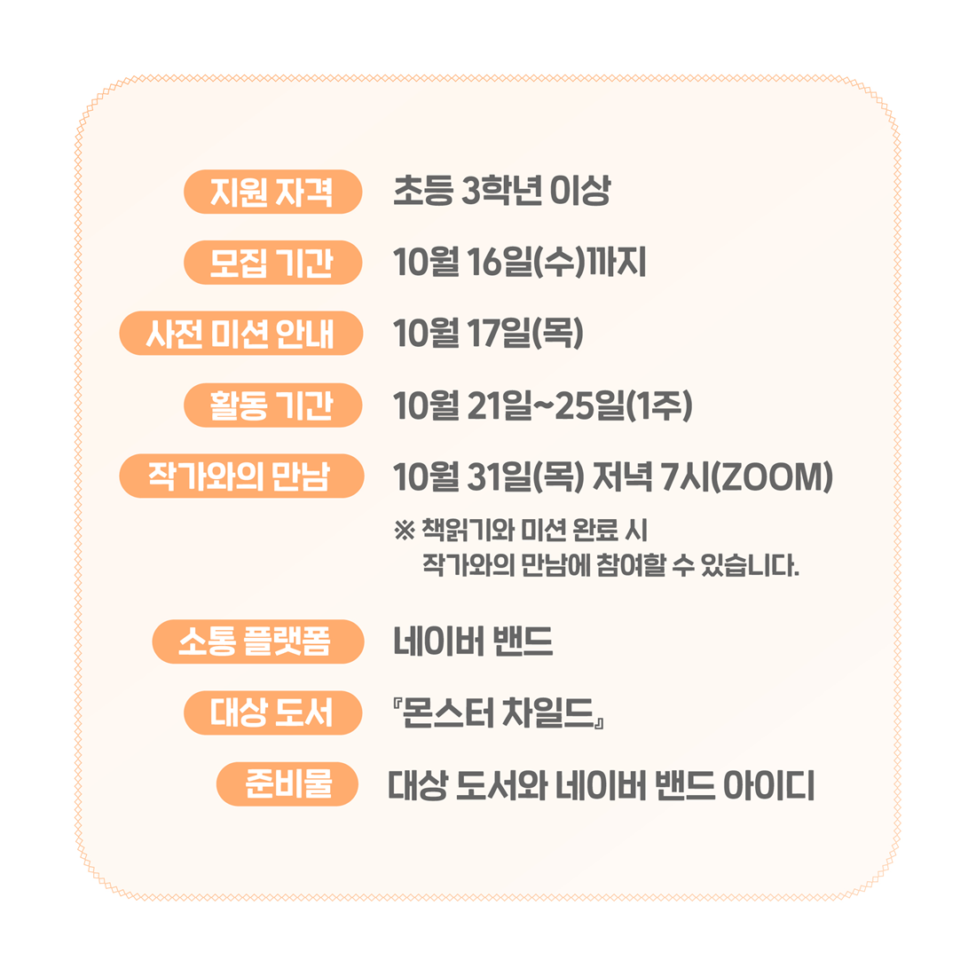 ♥ 이번 기수에서는 이재문 작가님이 쓰신 『몬스터 차일드』를 읽을 거예요!