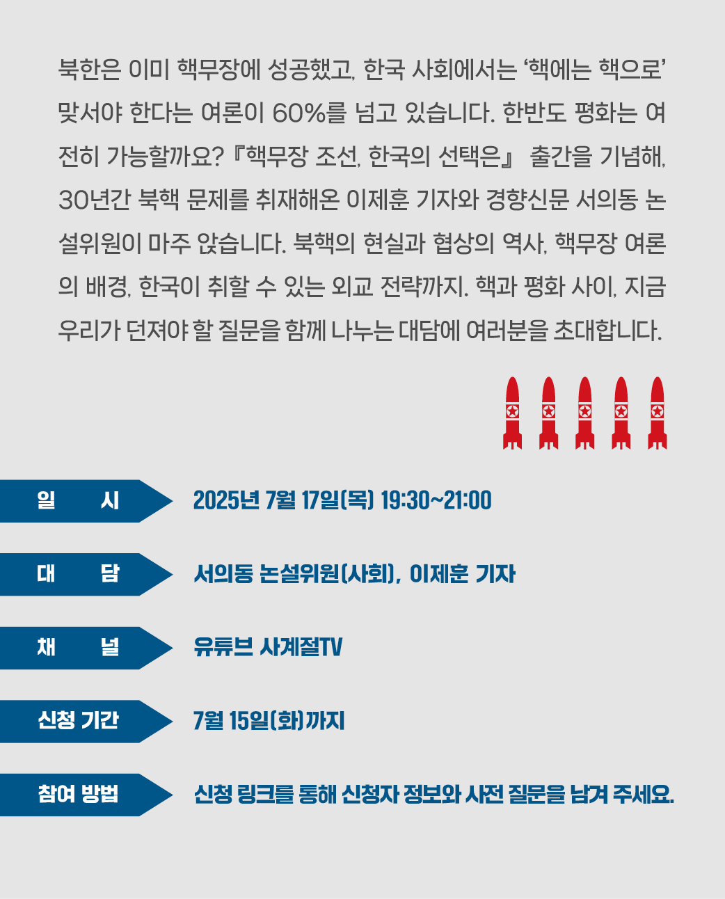 북한은 이미 핵무장에 성공했고, 한국 사회에서는 ‘핵에는 핵으로’ 맞서야 한다는 여론이 60%를 넘고 있습니다. 한반도 평화는 여전히 가능할까요? 『핵무장 조선, 한국의 선택은』 출간을 기념해, 30년간 북핵 문제를 취재해온 이제훈 기자와 경향신문 서의동 논설위원이 마주 앉습니다. 북핵의 현실과 협상의 역사, 핵무장 여론의 배경, 한국이 취할 수 있는 외교 전략까지. 핵과 평화 사이, 지금 우리가 던져야 할 질문을 함께 나누는 대담에 여러분을 초대합니다.