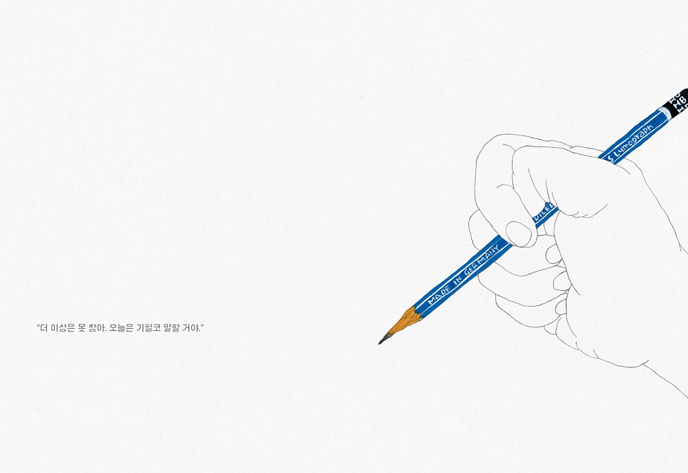 - 손에 쥔 사물을 물감으로 연하게 칠하다 보니까 연필 선이 유독 두껍고 진하게 보였어요. 그래서 자연스럽게 얇은 선으로 그리게 되었어요. 저는 연필을 칼로 깎는데 최대한 길고 가늘게 깎아요. 그래서 그림을 그리다 힘을 살짝만 주면 심이 ‘톡’ 하고 부러지면서 ‘툭’ 날아가요. 작업할 때마다 그게 마치 잔뜩 예민해진 오른손의 인내심이 ‘톡’ 하고 끊겨서 ‘툭’ 왼손에게 날아가는 것 같았어요. 꼭 불똥이 튀는 것처럼요. 그게 좋았어요.