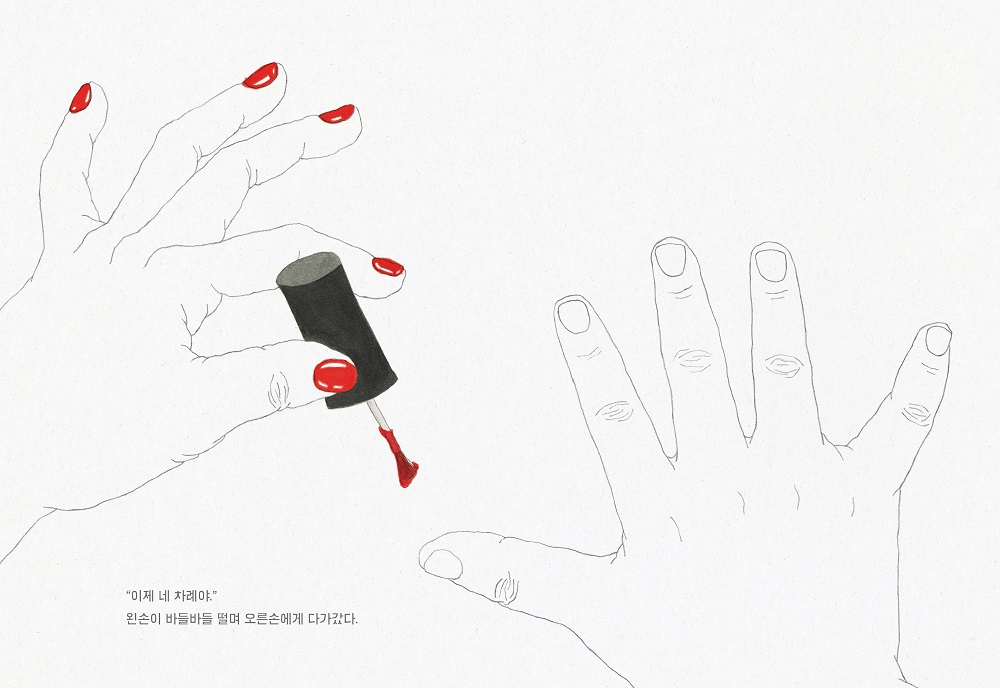 - 서로에게 번갈아 해주는 걸 고민했어요. 처음에는 손톱깎이를 떠올렸는데 이미 오랜 시간 왼손에게 훈련이 된 일이라 서로의 실력 차가 확연하게 보이지 않더라고요. 그래서 매니큐어를 골랐습니다. 그리고 손톱에 색칠을 하는 모습이 그림을 그리는 제 모습과 닮아서 더 끌렸어요.