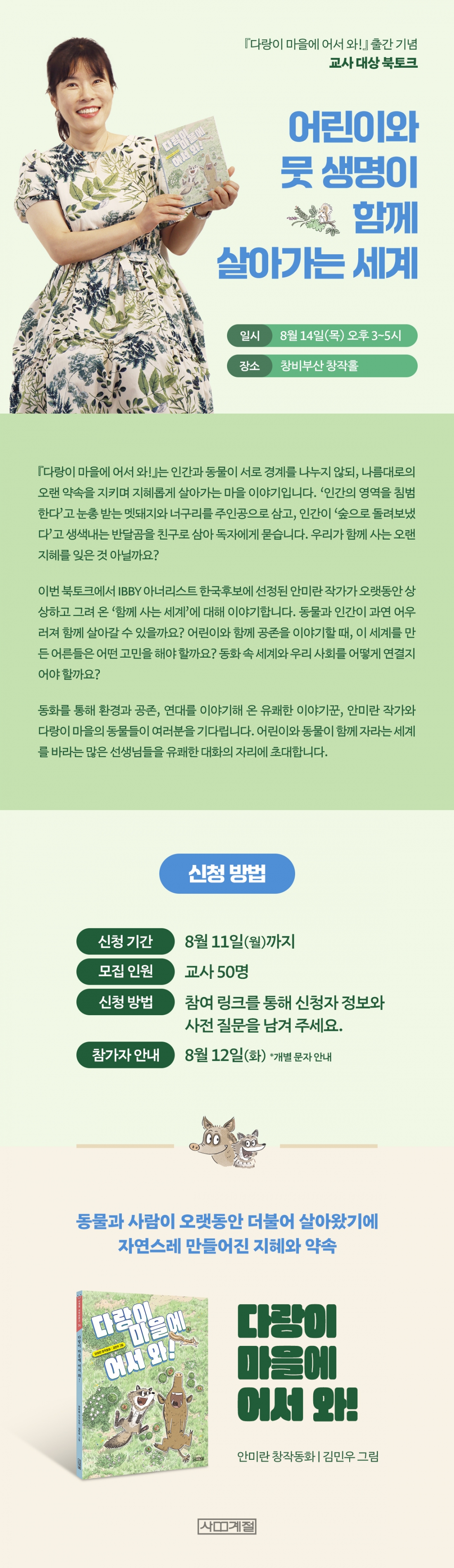 동화 속에서 우리 사회의 환경과 공존, 연대를 이야기해 온 유쾌한 이야기꾼, 안미란 작가와 다랑이 마을의 동물들이 여러분을 기다립니다. 어린이와 동물이 함께 자라는 세계를 바라는 많은 선생님들을 유쾌한 대화의 자리에 초대합니다.