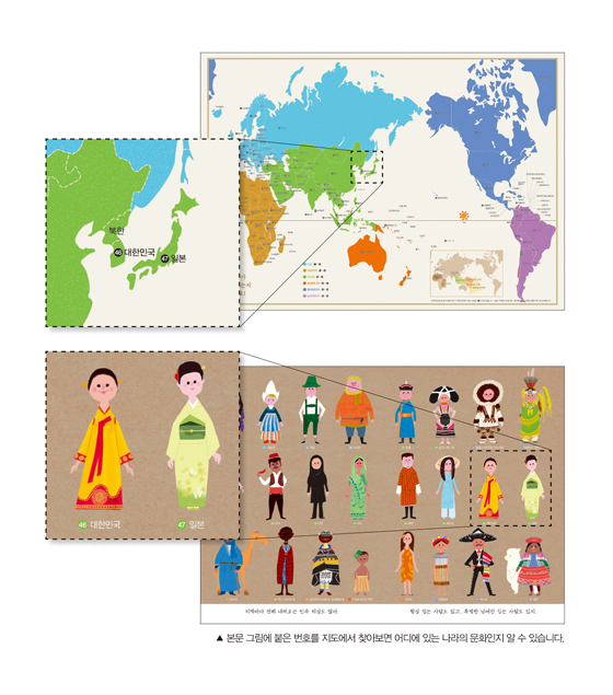 자켓에 있는 세계지도에서 어떤 나라가 어디에 있는지 살펴보자. 그 나라는 어디에 붙어 있는지, 우리나라와 먼지 가까운지. 그 나라에는 어떻게 생긴 사람들이 살고 있으며 그들은 무엇을 어떻게 먹는지. 본문 그림에 붙은 동그라미의 번호와 색을 지도에서 찾아보면, 본문에 나오는 세계 문화를 지리적, 공간적 특성까지 알 수 있다.