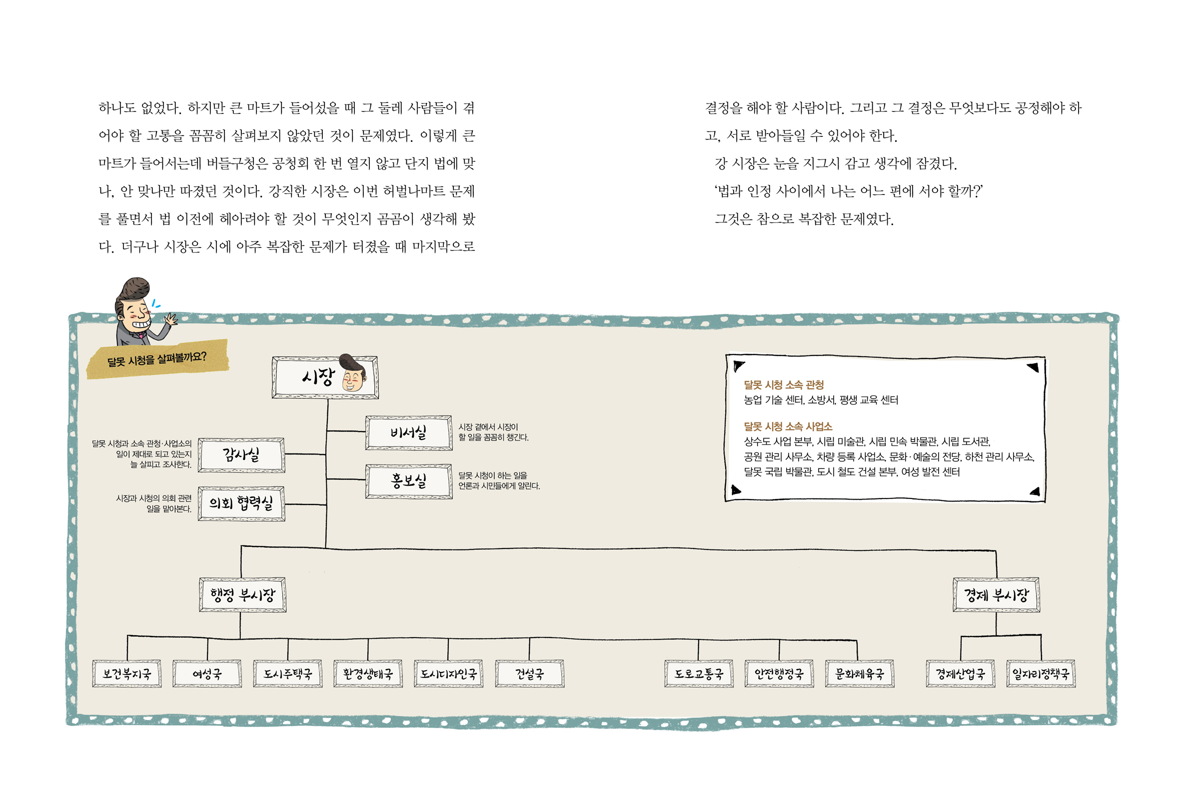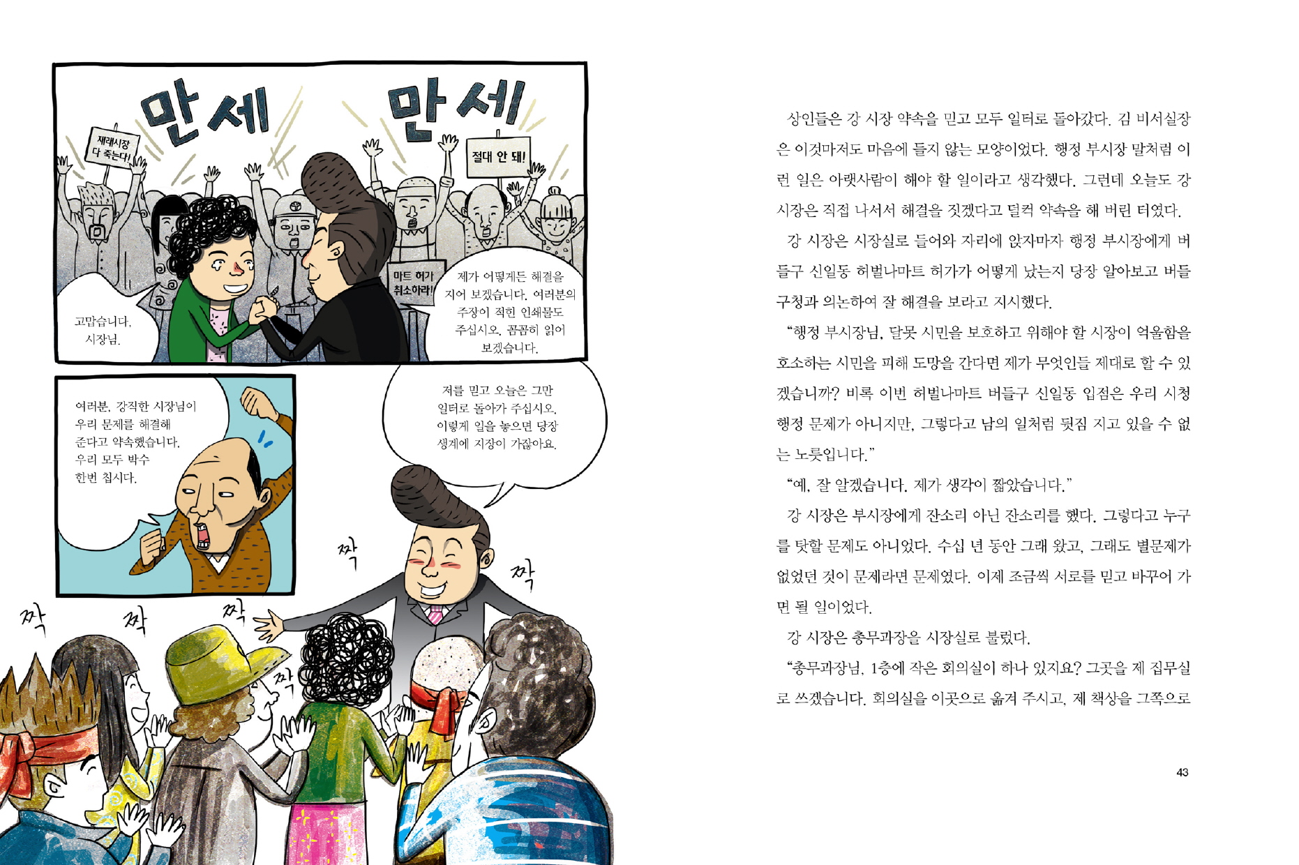 25년 동안 환경 운동 시민 단체에서 일했던 ‘강직한’이 달못시 시장으로 당선되었다. 강직한은 시장 고유 업무인 시의 행정을 이끌고 살피는 것 외에도 시민에게 어려움이 있다면 당장 달려가서 이야기를 듣고 해결 방법을 고민하는 열혈 시장이다. 시의 교통 문제, 상권 문제, 노동 문제, 자연재해, 시에서 주최하는 축제, 건물 공사, 주차장 건설 등 시 곳곳의 문제에 대해 늘 관심을 갖고 고민한다. 강직한에게 가장 중요한 것은 시민의 목소리에 귀를 기울이는 것이다. 시민에게서 문제를 들을 수 있고, 시민의 이야기를 잘 들으면 해결책도 거기서 찾을 수 있다고 여기기 때문이다. 이상적인 시장 ‘강직한’을 통해 국내 최초로 시장이 누구이고, 어떤 일을 하는지 이야기하는 이 책은 형식면에서도 만화를 대폭 삽입하여 읽는 재미를 극대화 시켰다. 만화와 글이 하나의 이야기로 끝까지 연결된 독특한 형식은 아이들의 마음을 사로잡기 충분하다.