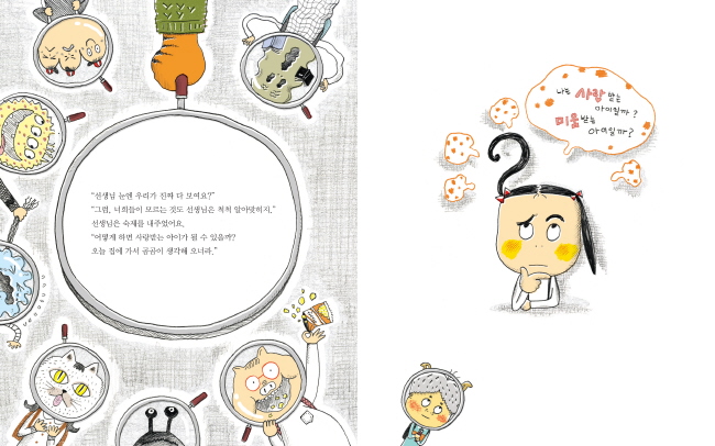 그지없이 서툴지만 천진하게, 자기만의 방법으로 답을 찾아가는 아이들의 모습이 이야기로, 그림으로 담겼습니다. 두 눈에 별을 뿅뿅 단 윤하, 구름만 한 고민을 끌고 가는 윤하, 살금살금 속삭거리는 윤하, 이히히히 시종 웃는 도훈이, 야호 하는 도훈이, 못난 똥강아지가 된 도훈이가 그림책의 매 장면에서 쿡쿡 웃음을 유발합니다.