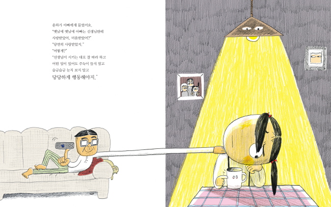 <두근두근 1학년 선생님 사로잡기>는 1학년 윤하와 무서운 호랑이 선생님의 이야깁니다. 봄바람이 살랑살랑 코끝을 간질이던 날, 윤하는 깡충거리며 학교에 갔더랬지요. 그런데 덜커덕 호랑이 같은 담임선생님을 만납니다. 처음 만난 날, 선생님은 색다른 숙제를 하나 내줍니다. 선생님 눈엔 너희들이 어떤 아이들인지 다 보인다며, 어떻게 하면 사랑받는 아이가 될 수 있을까 곰곰이 생각해 오라고 하지요. 이때부터 윤하의 고민이 시작됩니다. 할머니 말처럼 귀는 쫑긋, 눈은 말똥, 입은 쌩끗 웃으면 될까? 아빠 말처럼 주눅 들지 말고 눈치 보지 말고 당당하게? 엄마 말처럼 씩씩하게 심부름만 잘하면 만사 오케이? 어른들의 충고를 곧이곧대로 실천하던 윤하는 색다른 숙제에 딱 맞는 색다른 답을 얻습니다. 어른들은 생각지 못하는 일곱 살만의 답이 그림책에 담겨 있습니다.