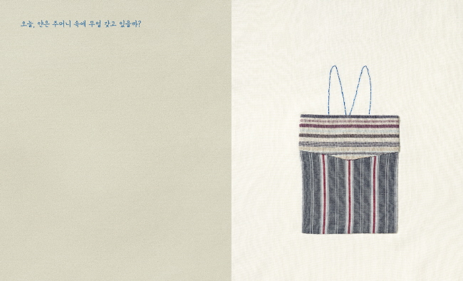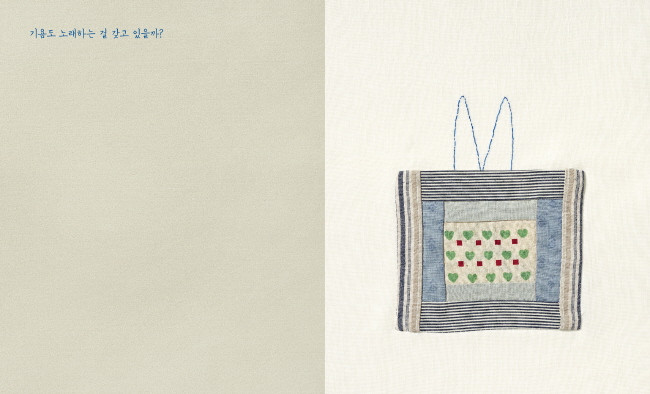 끝없는 작가의 상상력은 야무진 손끝에서 완성되었습니다. 무엇보다도 할머니의 손맛 같은 느낌이 전해져서, 편안하고 따뜻합니다. 물방울무늬, 줄무늬, 꽃무늬, 체크무늬가 있는 오래된 천을 바느질해 작은 주머니를 만들었습니다. 정겨운 주머니 속에 들어 있는 것은 단순한 자수로 표현했습니다. 색을 많이 쓰지도 않고 바늘땀이 촘촘하지 않은데, 그것만으로도 충분히 아름답습니다. 작가는 소박한 바느질 작업을 통해서 일상적인 것이 얼마나 아름다운지, 단순한 것이 얼마나 품위 있는지 보여 주는 듯합니다. 또한 예술은 멀리 있지 않다고, 천진한 마음으로 사물을 보고 담백하게 드러내는 데 삶의 재미와 멋이 있다고, 은근히 알려주는 듯합니다.
