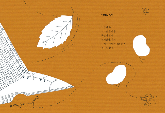 낙엽이 푹 / 커다란 발이 쿵 / 꽃잎이 살짝 / 절레절레, 휴~ / 그래도 과자 하나는 들고 / 집으로 왔다 (「개미의 일기」 전문)