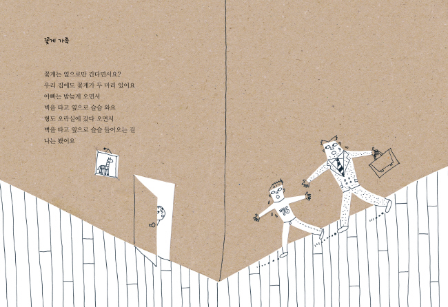 꽃게는 옆으로만 간다면서요? / 우리 집에도 꽃게가 두 마리 있어요 / 아빠는 밤늦게 오면서 / 벽을 타고 옆으로 슬슬 와요 / 형도 오락실에 갔다 오면서 / 벽을 타고 옆으로 슬슬 들어오는 걸 / 나는 봤어요 (「꽃게 가족」 전문)