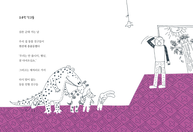 동시의 중요성과 필요성을 간과할 수 없는 것도 바로 여기에서 비롯된다. 동시는 간결하고 리듬감 있어 아이들이 소리 내어 읽는 데 전혀 어려움이 없다. 또한 작품마다 한 편의 이야기를 지니고 있어, 명료한 서사를 읽어 나가는 동안 ‘왜’ ‘어떻게’ 그러한 감정을 느끼고 언어화했는지 아이들 스스로 생각하도록 도와준다. 동시를 눈으로 읽고 입으로 발음해 보면서 아이들은 단어와 단어 사이의 호흡, 행과 연 사이의 흐름을 자기만의 속도로 이해해 간다. 그러면서 일상에 맞닿은 친숙한 상상을 시작으로 자기만의 생각을 풍부하게 꾸려 나간다.