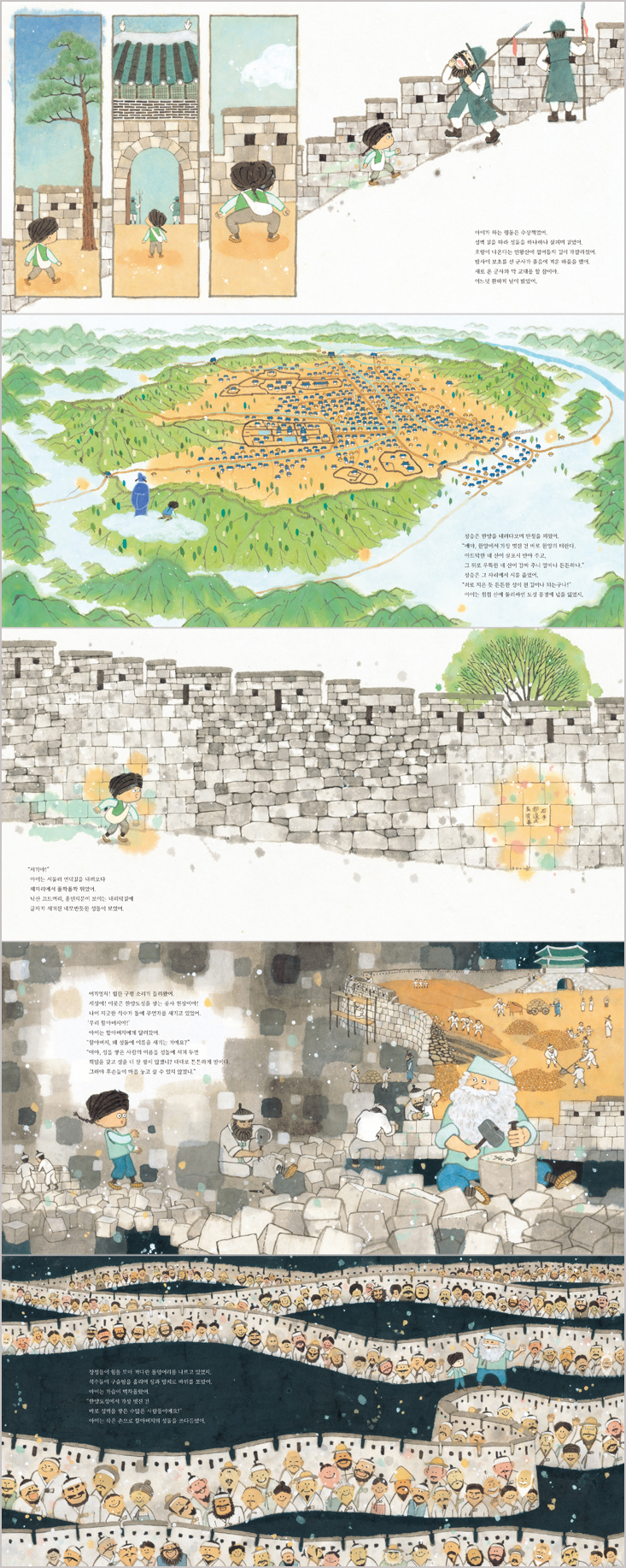 이의 할아버지인 오유선을 만납니다. 그리고 드디어 성벽을 완성한 수많은 보통사람들, 한양도성의 진짜 주인인 무명씨들을 마주합니다. 18.6km에 이르는 성벽을 만들기 위해서, 한양 밖에서 난 돌을 높디높은 산으로 옮겨 오고, 다듬어 깎고, 한 돌 한 돌을 쌓아 올린 수고로움이 가슴을 먹먹하게 합니다.