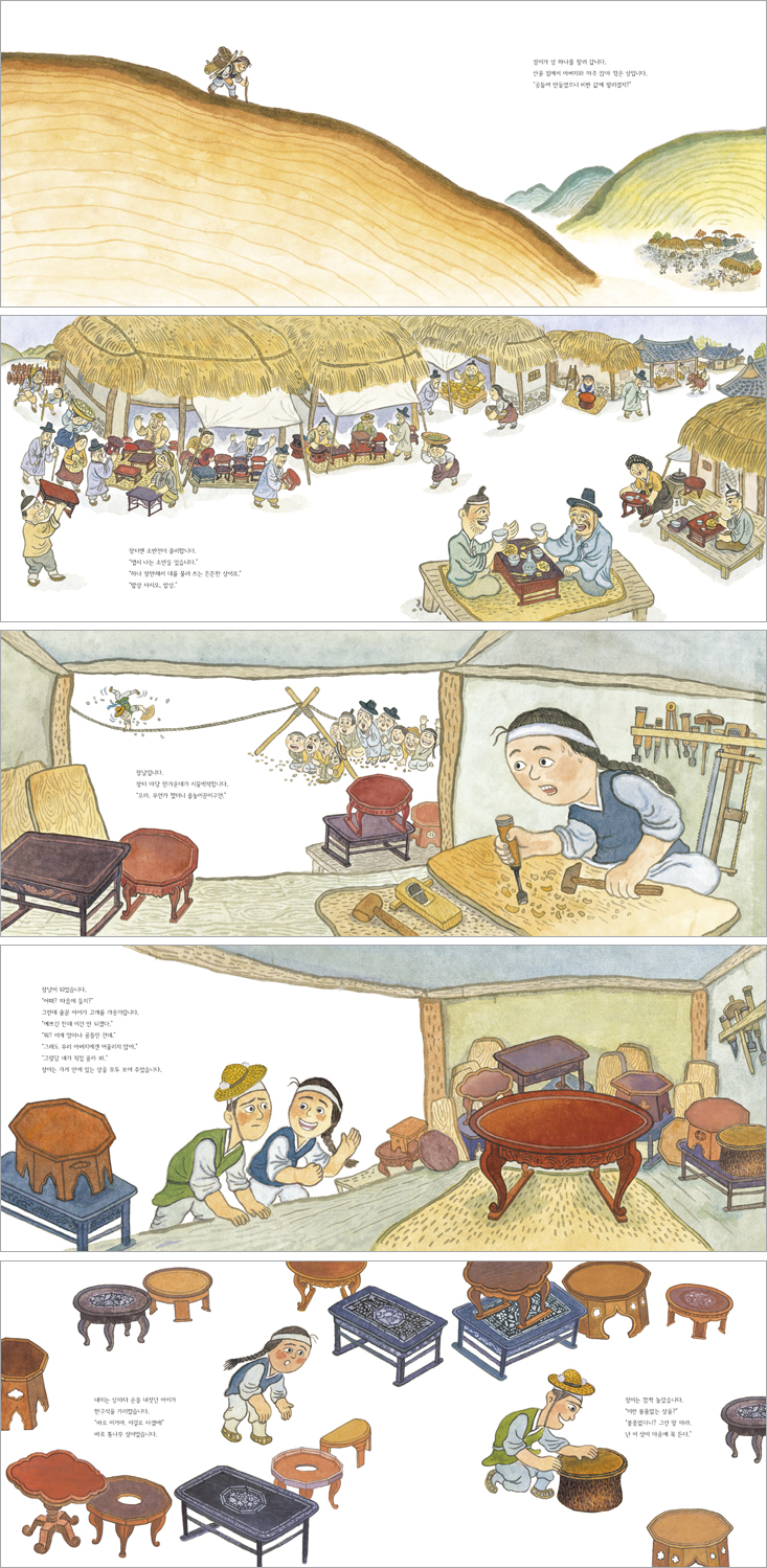 장이는 아버지와 깎은 통나무 상을 팔아 보려고 합니다. 그런데 장터 소반전에서 매끈한 상들이 팔리는 것을 보고 통나무 상의 모양새가 볼품없다고 생각하지요. 또한 상을 전문으로 만드는 상방을 지나가다가, 제대로 상을 만들어 보고 싶다는 생각을 합니다.