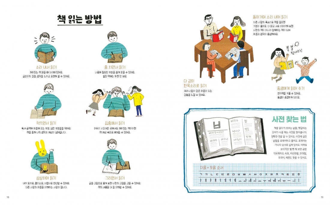 4. 책상에서 할 수 있는 다양한 활동에 대한 재미난 팁 책상에서 하는 행위들은 다양합니다. 글씨를 쓰는 법, 문구를 정확하게 쓰는 법 등 알아 두면 효율적으 로 책상 생활을 할 수 있습니다. 글씨를 쓸 때는 엉덩이를 의자 깊숙이 넣고 바른 자세로 앉아야 합니다. 엎드려서 글씨를 쓰면 글줄이 위로 올라가는 걸 보면 바른 자세가 중요함을 알 수 있습니다. 감정을 넣어서 글씨 쓰는 방법도 알려 줍니다. 그밖에 연필 깎는 법, 지우개로 도장 만드는 법, 이면지를 활 용해서 노는 방법까지도 재미있게 소개하여, 책상에서 보내는 시간까지도 즐겁게 만들어 줍니다.
