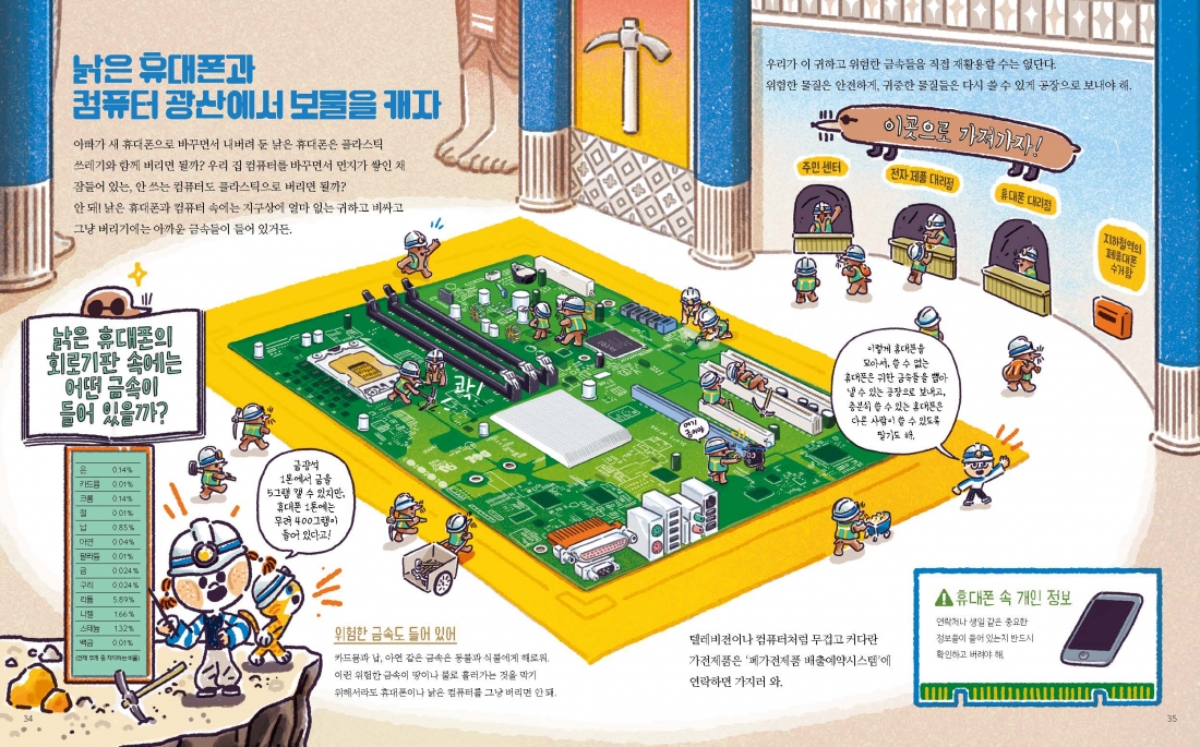 쓰레기 안에는 생각지도 못한 귀중한 것이 있을 수도 있고 위험한 것이 있을 수도 있습니다. 낡은 휴대폰이나 컴퓨터에는 귀하고 비싼 금속이 들어 있습니다. 자연에서 채취하는 것보다, 낡은 휴대폰에서 꺼내 쓰는 게 당연히 경제적이겠지요. 또한 휴대폰이나 컴퓨터 안에는 해로운 금속도 들어 있기 때문에 꼭 정해진 절차에 따라 버리는 게 중요합니다. 휴대폰이나 컴퓨터 같은 전자제품뿐만 아니라 약, 다 쓴 배터리, 형광등, 페인트처럼 위험 물질이 들어 있는 쓰레기들을 처리하는 방법도 알려줍니다.