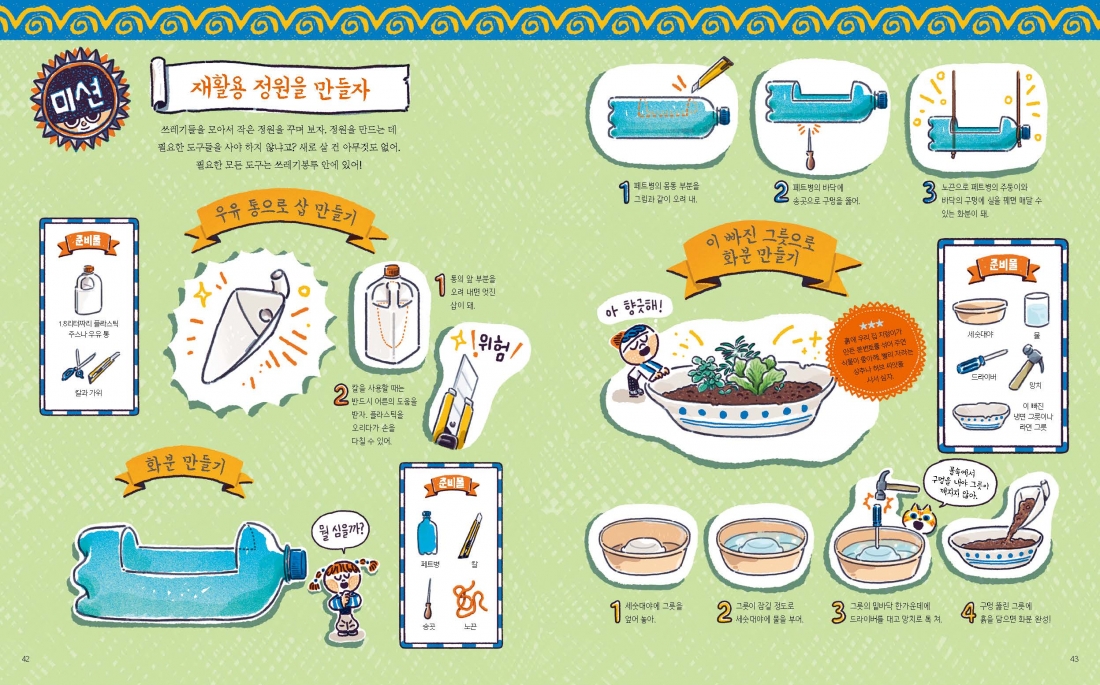 이 책에는 쓰레기를 활용할 수 있는 다양한 미션이 실려 있습니다. 집에서 쉽게 따라해 보면서, 버려질 물건들을 다시 사용하는 방법을 실천해 봅니다. 재생 종이 만들기, 깡통을 꾸며 정리함을 만들기, 요구르트 병으로 마라카스 만들기, 음식물 쓰레기를 줄일 수 있는 지렁이 농장 만들기 들을 따라해 볼 수 있습니다.