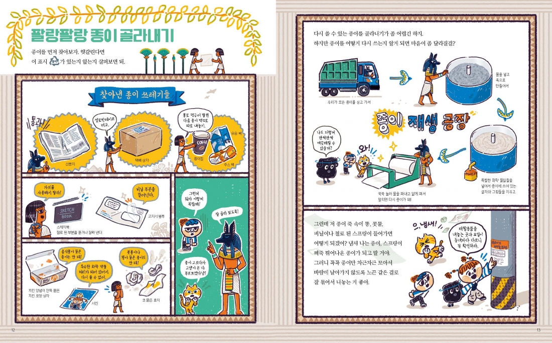 맨 처음 다양한 재활용 마크를 알려 주는 것으로 시작합니다. 종이, 유리, 철, 알루미늄, 플라스틱, 페트, 비닐 등등. 일상에서 자주 쓰이는 용기나 포장지에서 재활용 마크를 찾아봅니다. 우유팩, 음료수 병, 과자 봉지, 다양한 캔, 주방 용품 등등. 무심코 버린 쓰레기 안에 재활용이 가능한 것이 무엇인지 살펴봅니다.