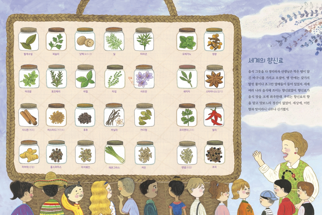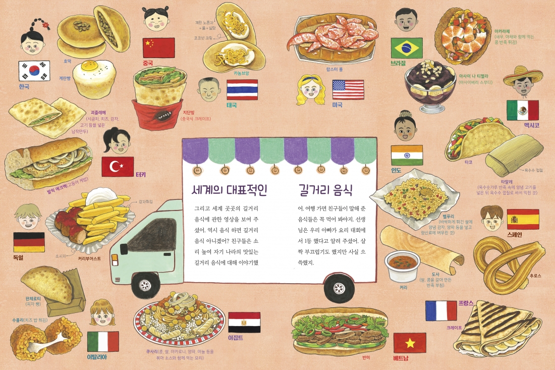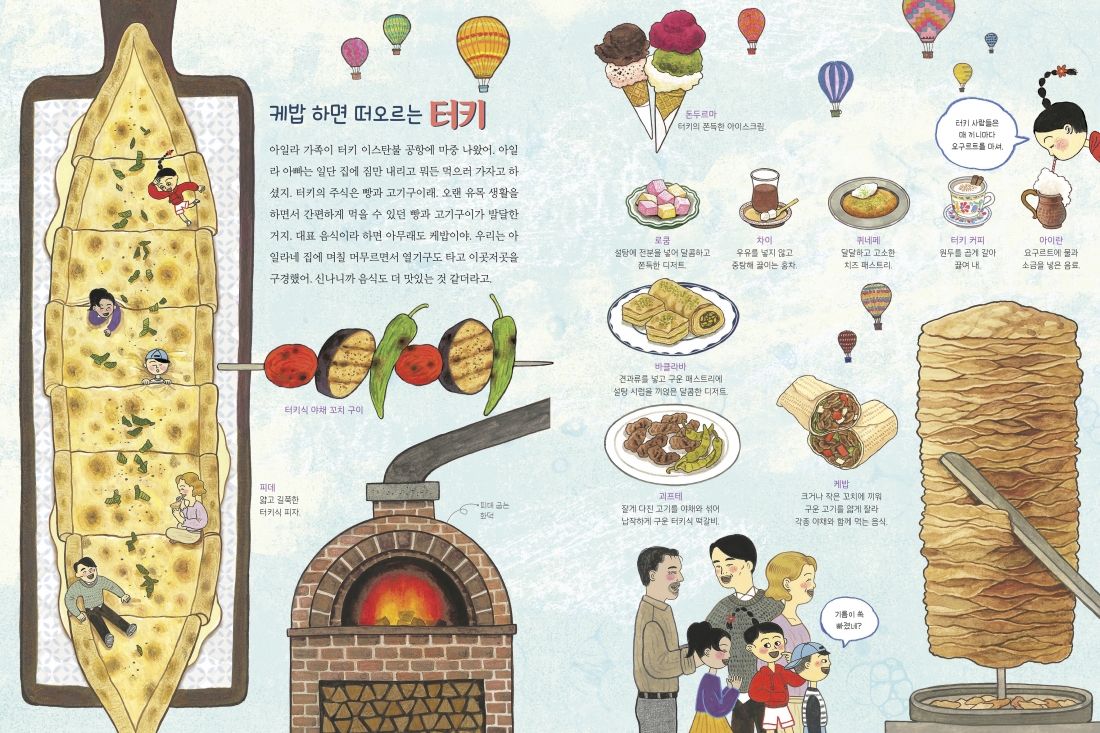 터키의 열기구 사이로 보이는 쫀득한 아이스크림 돈두르마와 피데의 치즈 이불을 덮은 아이들, 스페인의 거대한 파에야 볶기와 추로스에 대롱대롱 매달린 아이들. 이탈리아 파스타에 숨은 아이들 등 각 나라의 음식을 소개하면서 소소한 재미 요소를 꼼꼼하게 챙겼다. 책의 주인공들이 어디어디 숨어 있는지 찾아보는 것도 놓치지 말기를.