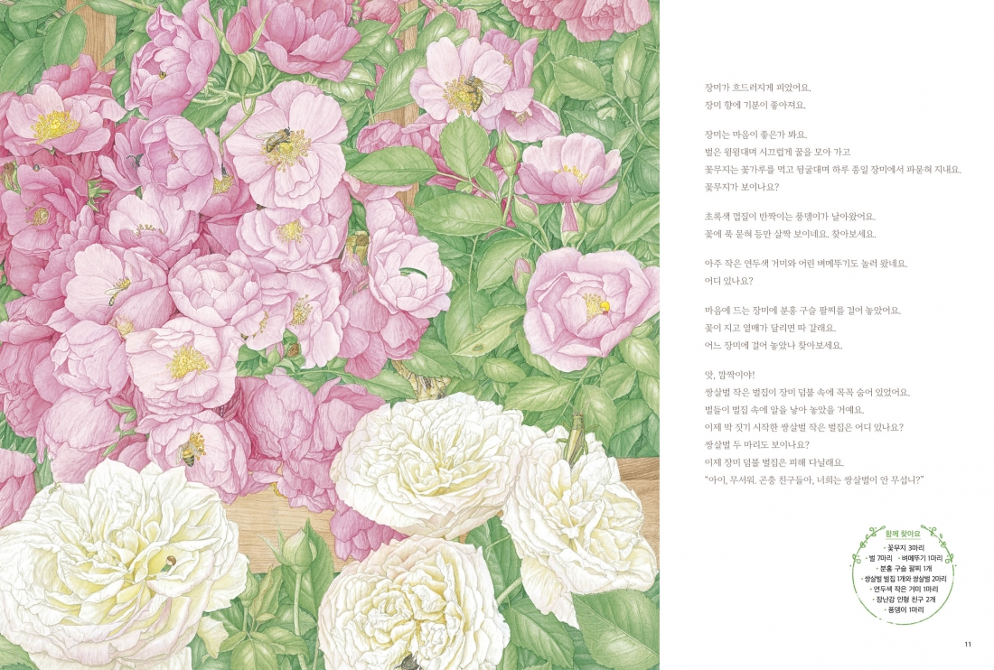 여느 숨은그림찾기 책처럼 그저 재미만을 담지 않았다. 각 계절별 꽃과 식물, 나무, 곤충 들의 모습을 해설 부분에 자세하게 실어 자연 속에서 자연물과 생명체를 알아갈 수 있는 정보도 함께 실었다. 또 찾아야 할 자연물을 잘 알 수 없다면 해설을 들춰 보며 알아갈 수도 있다. 한편 취재 노트에 실은, 작가가 취재하며 관찰한 곤충과 식물의 자연스러운 모습은 덤이다.