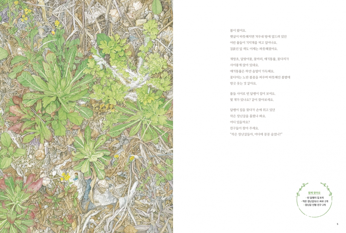 『풀밭에 숨은 보물 찾기』는 수려한 세밀화 속에 도토리, 벌, 나비, 꽃반지 등 자연물을 숨겨 놓은 ‘세밀화로 만나는 숨은그림찾기’ 책이다. 세밀화로 숨은그림찾기를 시도한 건 이번이 처음이다. 숨은그림찾기 책은 보통 복잡하고 반복적인 사진이나 일러스트로 구성되는 경우가 많지만 이제는 조금 더 ‘고급진’ 그림으로 ‘놀이’를 해 볼 수 있게 됐다. 세밀화를 감상하는 것만으로도 의미 있고, 그림 보는 안목이 높아지는데다가 재미난 놀이까지 더해 더없이 즐거워지는 그림책이다. 고품격 놀이그림책을 만날 좋은 기회가 될 것이다.