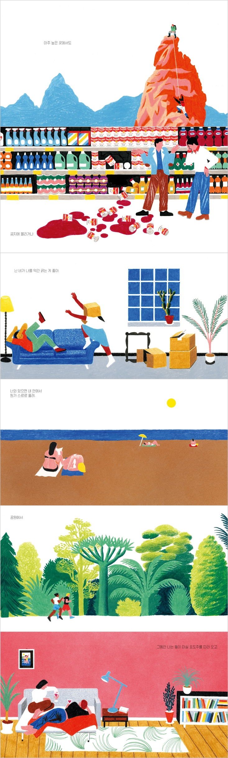 두 작가는 전작에서처럼 이번에도 자연스럽게 독자를 책속으로 이끈다. 과감하고 감각적이면서도 위트 있는 그림은 장면마다 다른 인물을 조명한다. 성별, 인종, 체형이 전부 다른 대상들을 보며 우리는 이 이야기가 우리의 삶에서도 이어지고 있음을 느낄 수 있다.