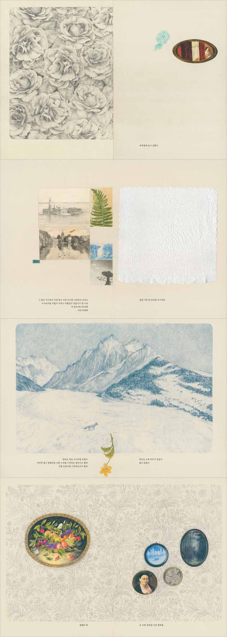 요안나 콘세이요는 이 시의 정경을 세피아 톤 위에 색연필로 부드럽게 그려 냈습니다. 기억의 깊이에 따라 또렷한 색채와 어스름한 무채색이 교차되고, 독백의 호흡에 따라 여백과 빽빽함이 드나듭니다. 작가만의 단정하고 풍부한 일러스트는 또 한 편의 소리 없는 시가 됩니다.