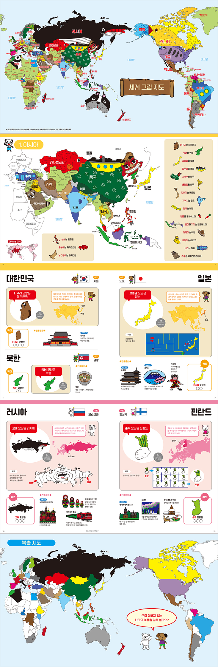특히 미취학이나 초등학교 저학년 아이들이 좋아할 만한 미로 찾기, 사다리타기, 퀴즈, 나라 이름 적기 등을 아이들이 어렵지 않게 풀어 낼 수 있는 수준의 활동으로 구성하여, 국가 정보나 국가의 지도 모양을 다시 한 번 익힘과 동시에 성취감을 느낄 수 있도록 했다. 또한 지도책을 다 보고 난 뒤엔 백지도 형식의 ‘복습 지도’를 넣어 지도 모양과 사물·동물 모양을 매치시키며 세계 지도를 반복적으로 익히고 각국의 모양새를 살필 수 있다. 놀이와 지도 학습을 완벽하게 접목시킨 것이다.