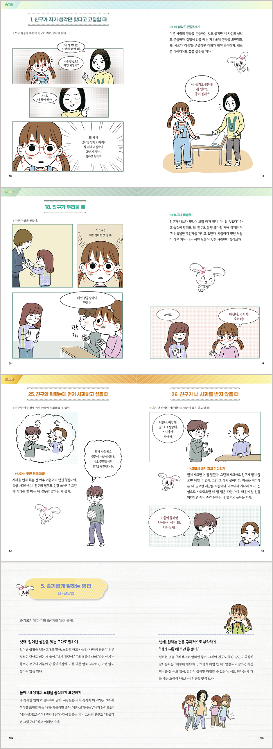 《예의 없는 친구들을 대하는 슬기로운 말하기 사전》은 사소해서 지나칠 법한 사례들도 놓치지 않고 가이드를 준다. 이 책을 통해 독자들은 다양한 갈등의 사례를 마주하고 이런 갈등이 나에게 잘못이 있어서 생기는 것도 아니고, 유독 나에게만 생기는 것이 아니며 누구나 자연스럽게 관통해 가는 일들이라는 것을 깨달을 것이다. 그 사실을 인지하는 것만으로도 제법 위안이 된다. 아이들이 조금 더 안정적인 정서를 바탕으로 성장해 나갈 수 있도록 응원한다.