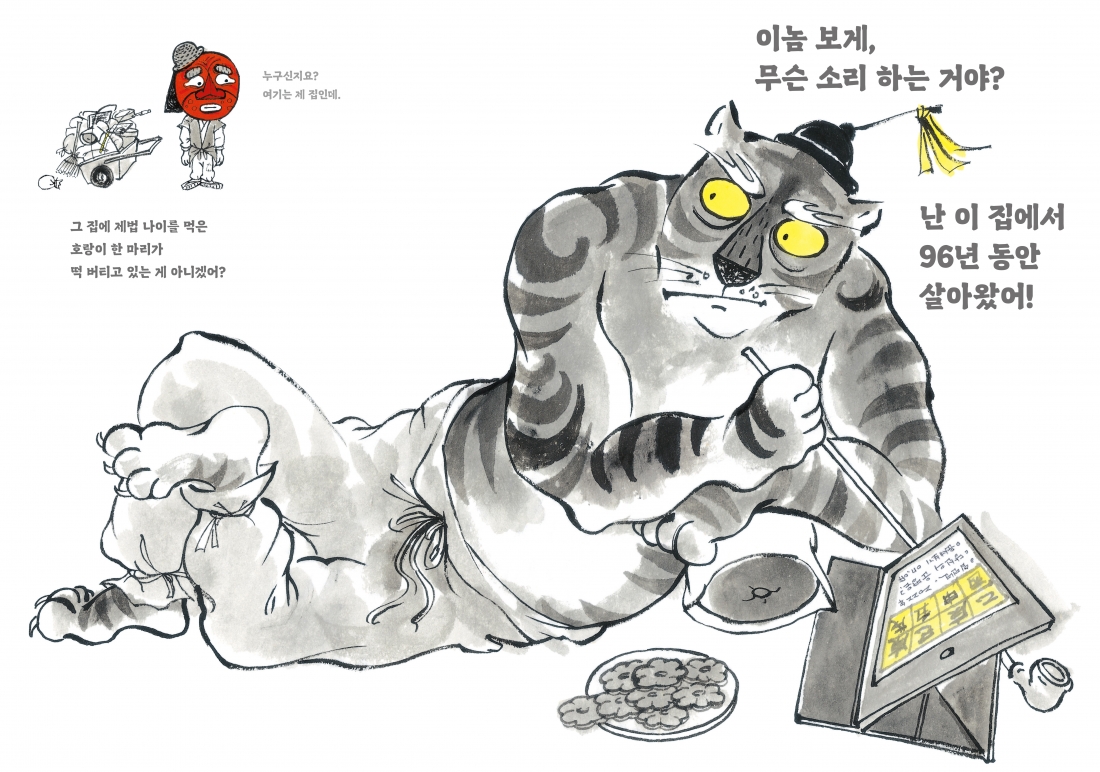 이솝 우화 ‘토끼와 거북이’를 토선생과 거선생의 구수한 입담으로 신선하게 풀어낸 박정섭, 이육남 작가가 새로운 그림책으로 돌아왔다. 이름하여 『삘릴리 범범』이라, 제목만 들어서는 도통 감 잡을 수 없는 이야기일 터, 호랑이해에 맞춰 호랑이가 나오는 그림책을 만들었다 하니 기대를 가득 품어도 좋으리라. 두 작가가 이번에 주목한 것은 옛이야기 ‘춤추는 호랑이’다. 피리를 불어 호랑이 떼를 물리친 이야기를 줄기로 삼고 작은 집 하나 갖고 싶은 소금 장수, 황금부동산 주인으로 변신한 토선생, 스트리트 댄스를 추는 호랑이 캐릭터를 만들어 돈과 집에 울고 웃는 요즘 사람들의 애환을 솜씨 좋게 녹여 냈다.
