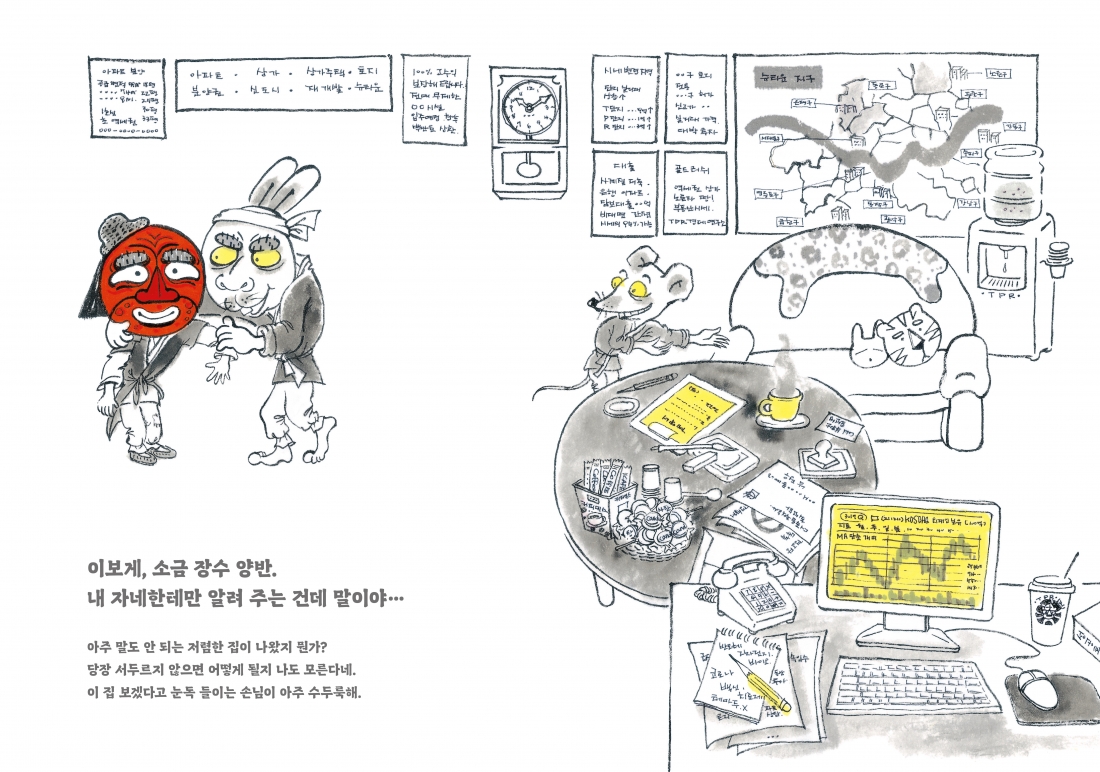 그림 속에 숨은 디테일도 풍성하다. 황금부똥산 간판, 뉴타운 지구 지도, 주식 종목을 메모한 수첩과 초품아, 몰세권, 편세권 등 부동산 신조어를 현실감 있게 표현하여 ‘내 집 마련’을 꿈꾸는 소금 장수의 해학 가득한 이야기를 생생하게 전한다.