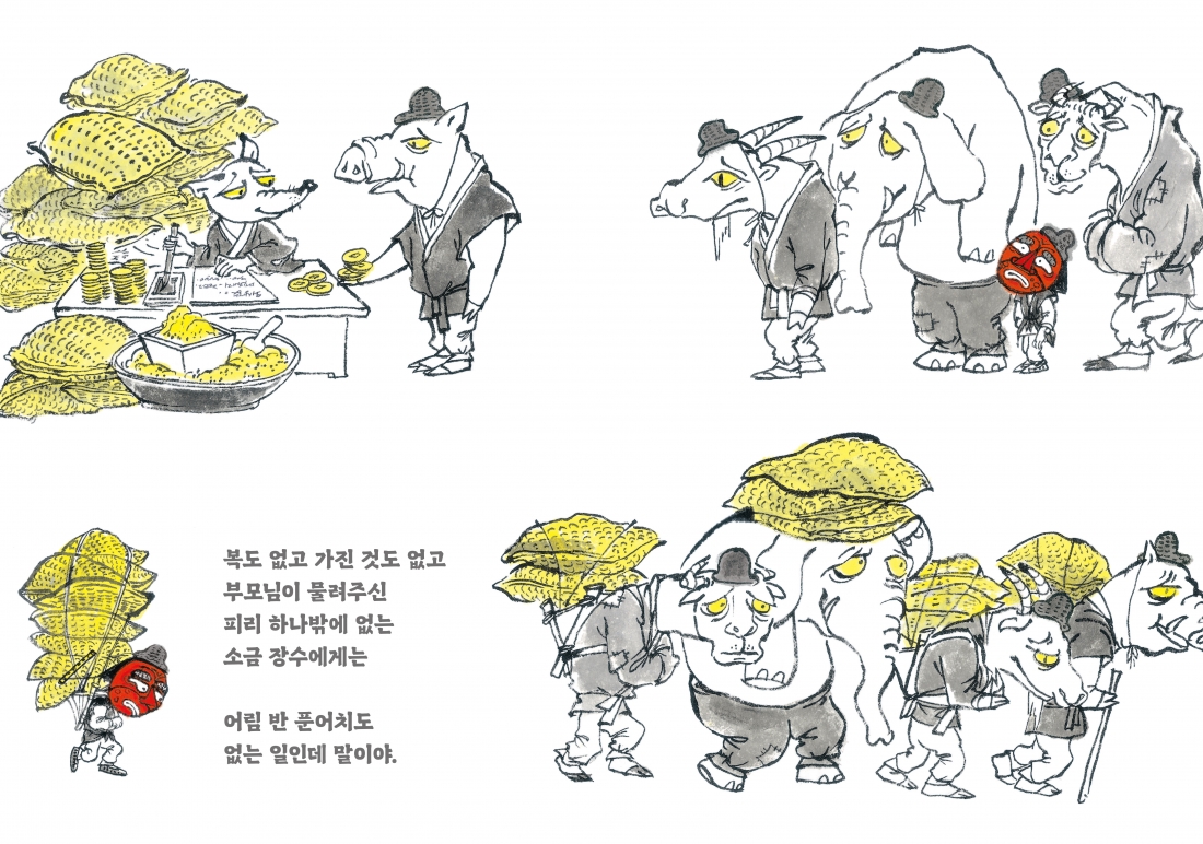 소금 장수는 토선생의 꾐에 넘어간 걸 깨닫고 슬피 울다가 부모님이 물려주신 피리를 불게 된다. 삘릴리 삐리리리 삘릴리 삐리리리… 소금 장수 피리 부니 호랑이들 춤을 추고 구경꾼이 모여드니 엉겁결에 돈을 쓸어 모으고, 소금 장수의 미래가 황금빛으로 물들 것 같던 찰나, 또 한 번의 시련이 닥쳐오는데! 인생의 단맛과 쓴맛을 경험하는 소금 장수의 에피소드가 이야기 화자의 추임새와 구성진 입담과 가락을 따라 펼쳐진다. 서로를 속고 속이며 돈과 부를 좇는 이야기가 마지막까지 휘몰아치듯 전개된다. 글을 쓴 박정섭 작가는 자기 집을 갖고 싶은 소금 장수의 소박한 마음을 중심에 두고 돈을 둘러싼 왁자지껄한 소동극으로 이야기를 풀어낸다. 흥과 한, 기쁨과 슬픔이 교차하는 호랑이들의 춤사위는 소금 장수처럼 평범한 사람들의 정서를 드러내며 돈에 눈먼 세상을 풍자하는 춤판처럼 신명 나게 그려진다.