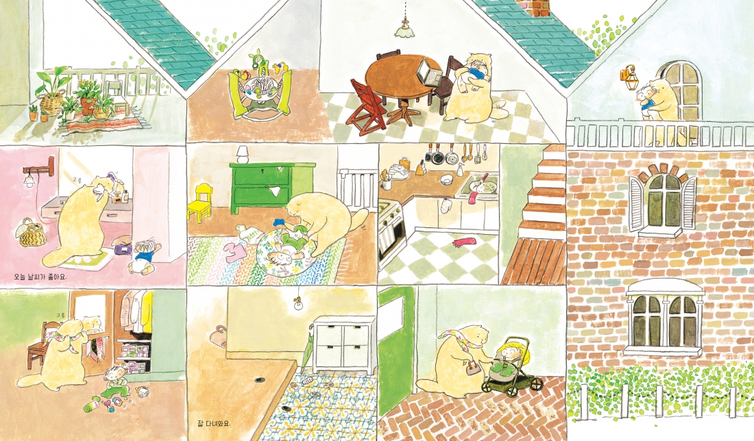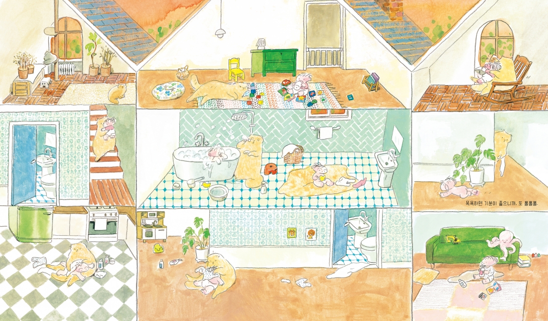 아기가 으앙 우는 소리와 함께 아침이 시작됩니다. ‘고롱고롱 씨’와 아기 ‘바다’의 어느 평범한 하루입니다. 작가는 집 단면도를 닮은 컷 구성으로 칸칸이 하루의 모습들을 묘사하며 아침부터 밤까지의 흐름을 조밀하게 펼쳤습니다. 밥 먹고 놀고 낮잠 자고 산책하고 집안일 하고 목욕시키고 재우고 쉬는, 평범한 육아 일상 같지만 시간 조각에 포착된 장면과 감정이 하나하나 모여 하루를 소중하게 채웁니다. 세심하고 정성스런 표현력으로 사람과 사람, 사람과 공간이 서로를 돌보는 따스한 정서를 담아낸 그림책입니다.
