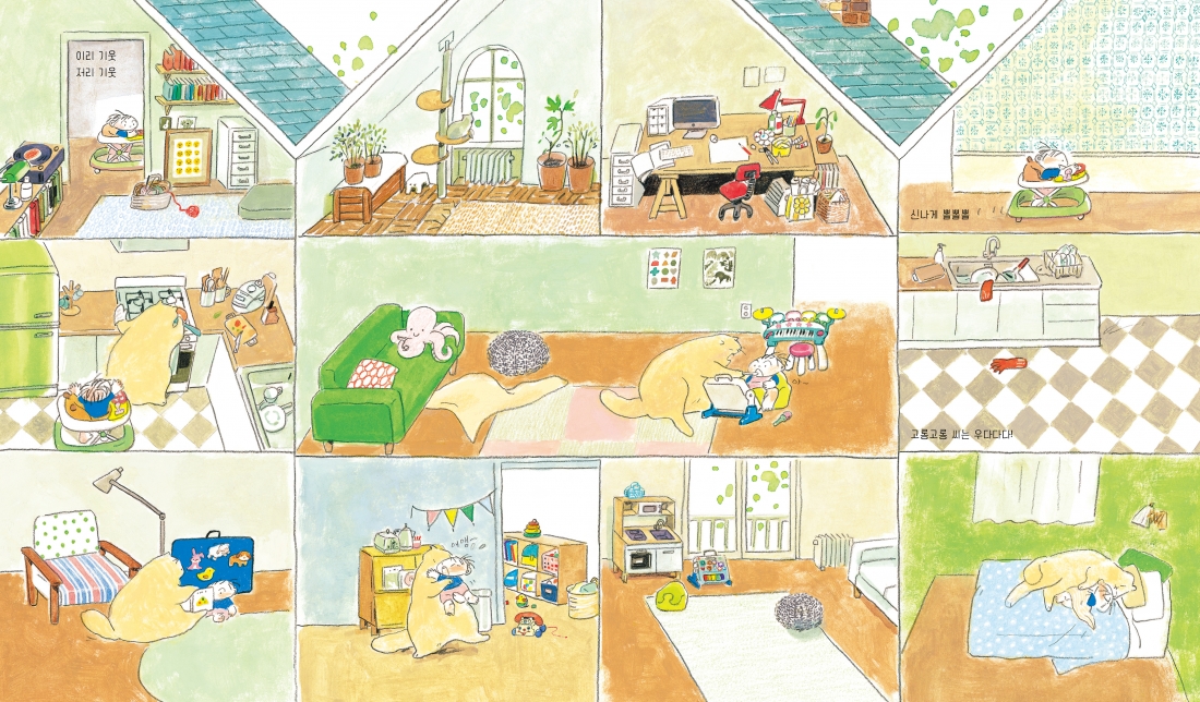 고롱고롱 씨의 하루는 물리적인 여느 하루로 보이지만 그 기억으로 재창조된 시간입니다. 숱한 하루 중 유독 와 닿은 일상의 모습, 느낌, 아기의 행동, 양육자의 바람들을 방 한 칸 한 칸에 그려 넣어 집 안의 시간을 오밀조밀 만들었습니다. 그 안에는 힘겨움도 보이고 즐거움도 보이고 치열함도 평온함도 있습니다. 얼마 만인지 모를 외출 시간에는 고롱고롱 하우스의 목소리, 마음의 소리가 잠시 사라지고 바깥의 소리와 공기가 들어옵니다. 바다와 고롱고롱 씨가 각자의 즐거움을 느끼는 동안 독자들은 그들의 감정을 읽어 보게 됩니다. 줄곧 웃는 바다가 무얼 느끼고 있을까, ‘고롱고롱’ 소리에는 어떤 기분이 담겨 있을까 상상해 보면서요.