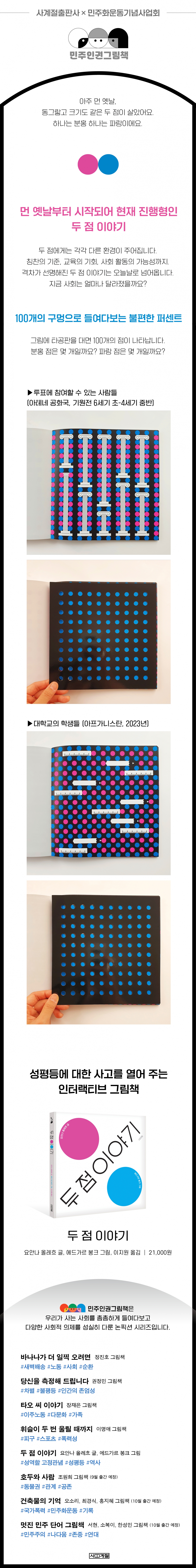 『두 점 이야기』는 타공판을 이용한 놀이 형식으로 성인지적 관점의 사고를 열어 주는 그림책입니다. 조화로운 그림 위에 가져다 대는 검은 판이 어쩌면 나도 모르게 길러진 선입견의 벽일 수도 있습니다. 요안나 올레흐 작가와 에드가르 봉크 작가, 이지원 번역가는 평등과 인권 주제의 그림책 작업을 함께해 왔습니다. 그리고 이번 ‘민주인권그림책’의 유일한 해외 작가로서 성평등을 둘러싼 이슈를 넓은 시야에서 바라보았습니다. 여성의 경험이 현저히 억눌린 인류의 역사를 명확하게 짚고, 그것이 해결되지 않았음을 알려 줍니다. 그렇다고 이 그림책이 여성의 권리와 남성의 권리를 수치적으로 똑같이 만들자는 이야기를 하는 것은 아닙니다. 과거의 통념에서 벗어나 성별의 치우침 없이 건강한 공동체를 이루며 살아가기 위해, 우리의 노력이 필요하다고 말합니다. 그 노력은 의식을 일깨우는 질문에서 출발할 것입니다. “여러분은 어떻게 생각하세요?”
