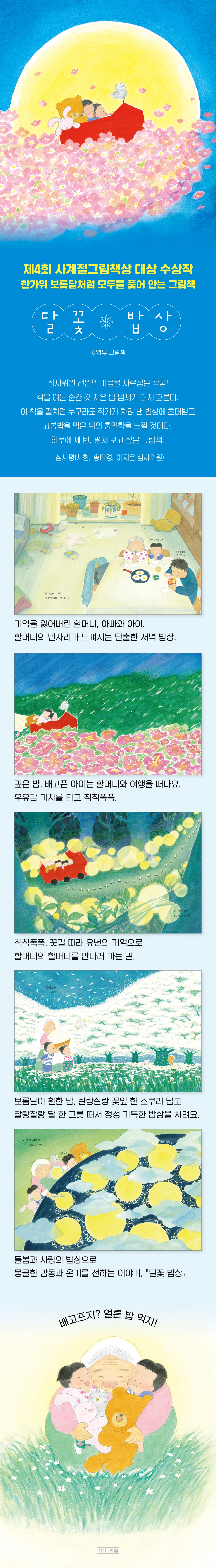 기억을 잃어버린 할머니, 아빠와 아이. 세 식구의 저녁 밥상이 단출합니다. 매일 가족들을 돌보며 밥을 차리던 할머니의 빈자리가 고스란히 느껴지는 밥상. 한밤중에 배고픈 아이는 여자아이로 변한 할머니와 함께 여행을 떠납니다. 우유갑 기차를 타고 칙칙폭폭. 산과 들을 건너 개미 따라 반딧불이 빛 따라 고봉밥 닮은 초가집을 찾아갑니다. 보름달이 환한 밤에 펼쳐지는 아이와 할머니의 여정이 아름답고 뭉클한 감동을 선사하는 이야기입니다. 지영우 작가의 『달꽃 밥상』은 “돌보는 존재에서 돌봄을 받아야 하는 존재가 된 할머니가 삶의 여정 안에서 보듬어지는 내용을 감동적으로 그려” 냈다는 평을 받으며 제4회 사계절그림책상 대상을 수상했습니다.