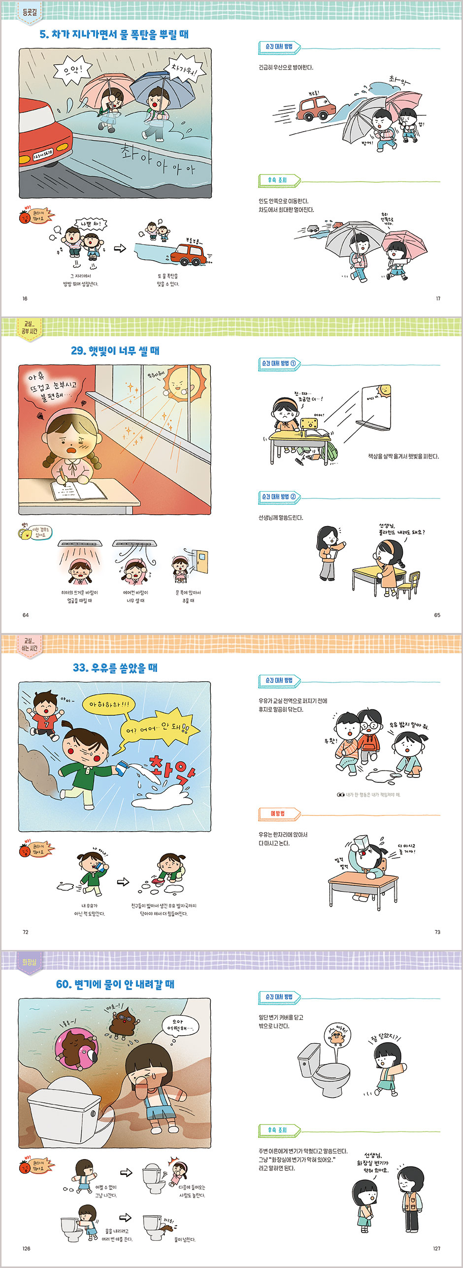 『학교생활 위기 탈출법1』은 위기 상황과 솔루션에 대해 총체적이면서도 촘촘하게 다루었다. 먼저 위기 상황을 소개하고 그 위기 상황에서 하면 안 되는 행동을 짚어 본다. 때론 위기 상황과 비슷한 여러 가지 사례를 소개하기도 한다. 그렇게 여러 방면에서 위기를 살펴본 뒤 그 상황에서 어떻게 대처하면 좋을지 반짝이는 ‘순간 대처 방법’을 제시한다. 필통을 떨어뜨렸을 땐 주워서 다시 책상 ‘안쪽’에 놓는다든지, 벌이 옆에 날아다니면 ‘가만히’ 있으라든지, 양말에 구멍이 나면 왼쪽 오른쪽을 바꿔 신어 보라든지 하는 매우 실용적인 방법이다.