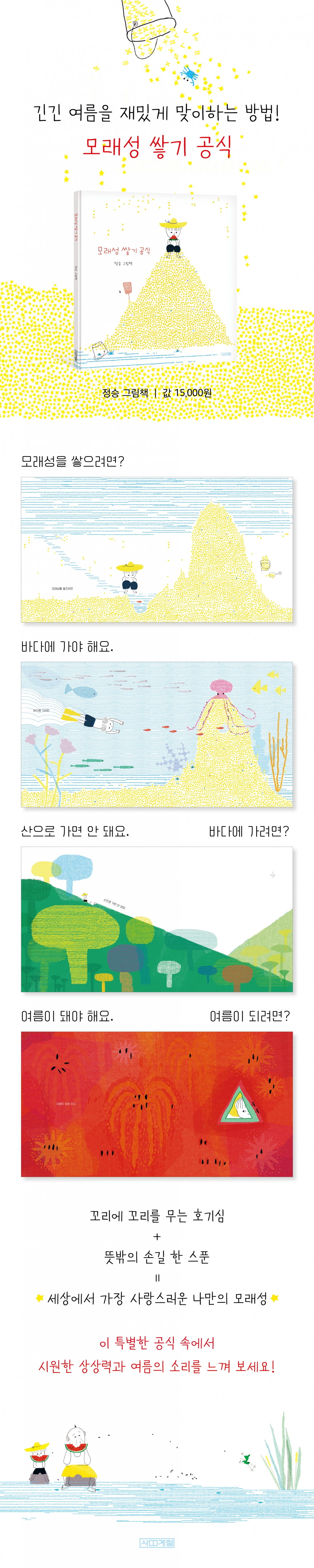 단, 이 모든 것은 평범한 예상을 훌쩍훌쩍 뛰어넘을 것입니다. 『모래성 쌓기 공식』에 모래성을 쌓는 데 실제로 필요한 준비물은 이미 있습니다. 모래성 쌓기를 위해 여름을 즐기고 자연을 살피는 마음을 새롭게 찾고 있지요. 나를 둘러싼 세상을 당연하게 여기지 않고 작은 변화들을 알아봐 주는, 어린이의 순한 마음이 담긴 그림책입니다.