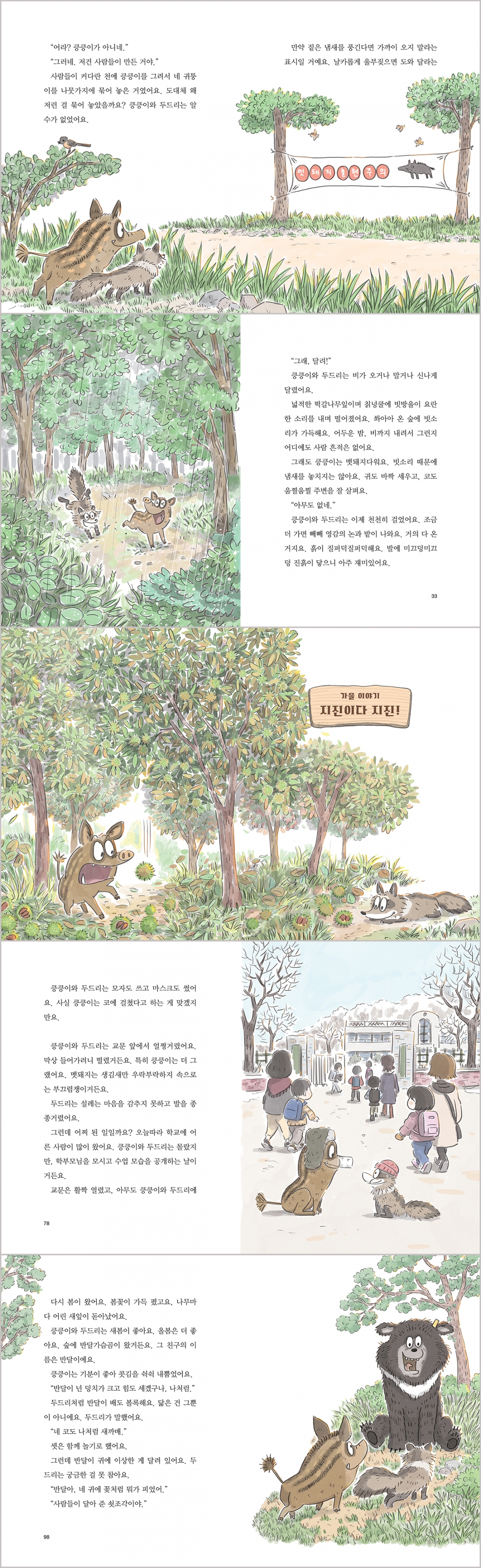 그렇다고 킁킁이와 두드리가 인간을 가깝게 여기는 건 아니다. 어른 사람이 왜 밤나무를 마구 흔들어, 벌어지지도 않은 밤송이를 억지로 열면서까지 알밤을 독차지하려 하는지 도무지 이해할 수 없다. 때가 되면 밤나무가 밤송이를 내줄 테고, 그때는 가시송이가 벌어져 알밤이 톡 떨어질 텐데 말이다. 욕심쟁이 인간이 제풀에 놀라 던져두고 간 알밤은 킁킁이와 두드리, 그리고 온 산의 동물들이 적당히 나누어 먹는다. 그러고도 숲에 남은 알밤은 아마도 나중에 밤나무로 자랄 것이다.
