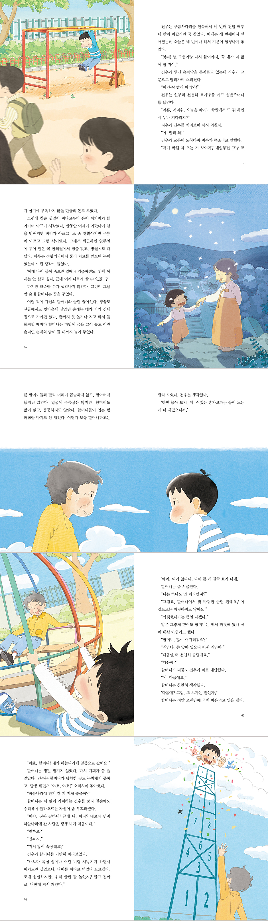 “이 동화를 쓰는 동안 사방치기나 땅따먹기를 오랜만에 해 보면서 다짐했어요. 앞으로는 놀면서 살 거라고요. 어린이나 어른이나 날마다 노는 시간을 가져서 세월이 지나도 마음속에서 은은히 빛나는 보석 같은 추억을 많이 만들면 좋겠어요. 혹시 알아요? 건우와 순례 할머니처럼 둘도 없는 친구가 될지도 모르잖아요!” _작가의 말