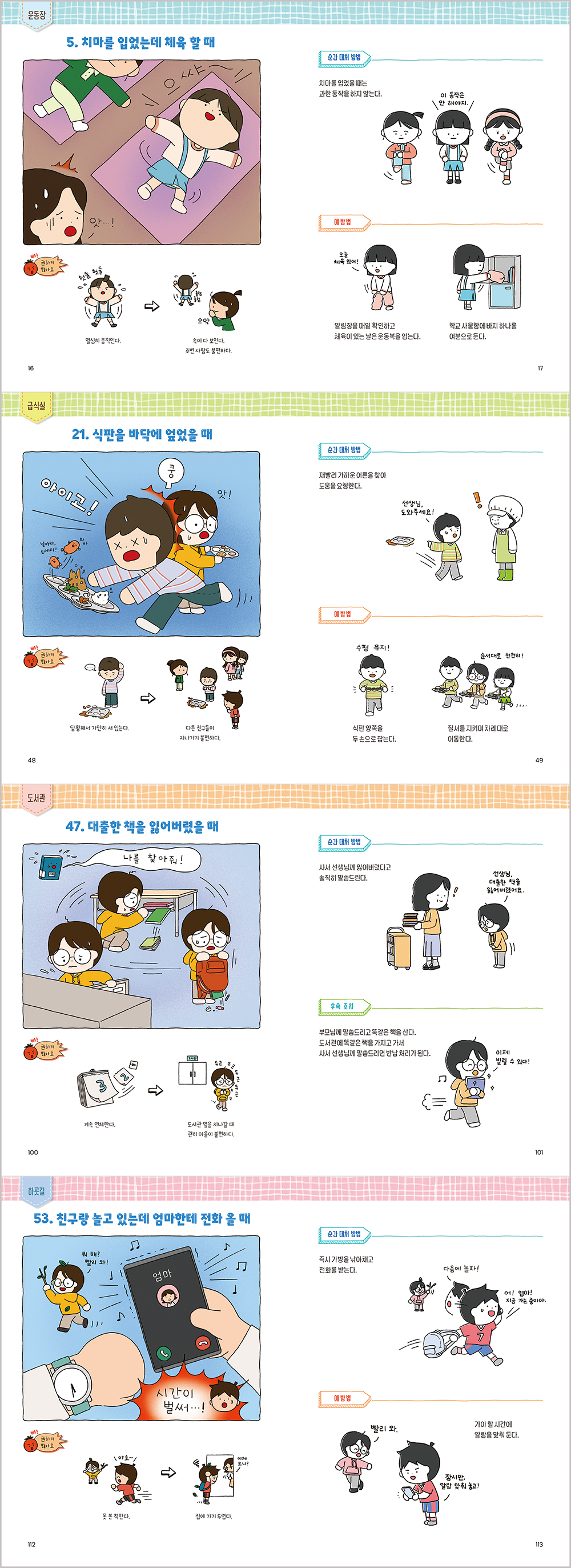 그림책이 아님에도 그림이 글보다 더 많다. 매 상황, 솔루션, 유사 사례와 대처 방법을 일일이 그림으로 표현하여 아이들이 알기 쉽게, 또 재미있게 읽도록 구성했다. 특히 저학년 아이들용이고, 실제적인 상황과 방법이 정확하게 전달되어야하기 때문이다. 윤식이 작가의 작고 사랑스러운 그림은 자세히 보면 더 재밌다. 차근차근 그림을 보며 등장하는 아이들의 동작, 표정, 상황 속 숨은 유머를 찾는 재미도 놓칠 수 없다.