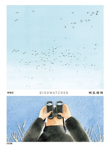 변영근 작가의 그래픽 노블 『버드와처』(Birdwatcher)는 제목 그대로 탐조인을 그리면서 새를 보는 것에 대해 이야기합니다. 탐조는 새를 조용히 기다리고, 세심히 관찰하고, 발견하는 기쁨을 나누는 것. 탐조 활동은 쌍안경을 사고 도감에서 새 이름을 찾고 새 관련 공부를 하는 것에 그치지 않습니다. 청년은 새를 바라보면서 어느새 자신을 있는 그대로 바라보게 됩니다. 파랑새를 찾는 여정을 통해 ‘나’를 발견합니다. 인트로 장면에서 무리와 다른 색깔로 하늘을 날던 흰 새는 하얀 머리와 옷차림의 청년으로 자연스레 이어지고 청년은 탐조에 깊이 빠져들수록 옷의 색깔이 파랑새와 비슷해집니다. 새의 이야기는 청년의 이야기로 포개지며 전개됩니다. 밤과 낮, 안과 밖, 어두움과 빛의 대비를 통해 인물의 심리 변화가 부드럽게 드러납니다.