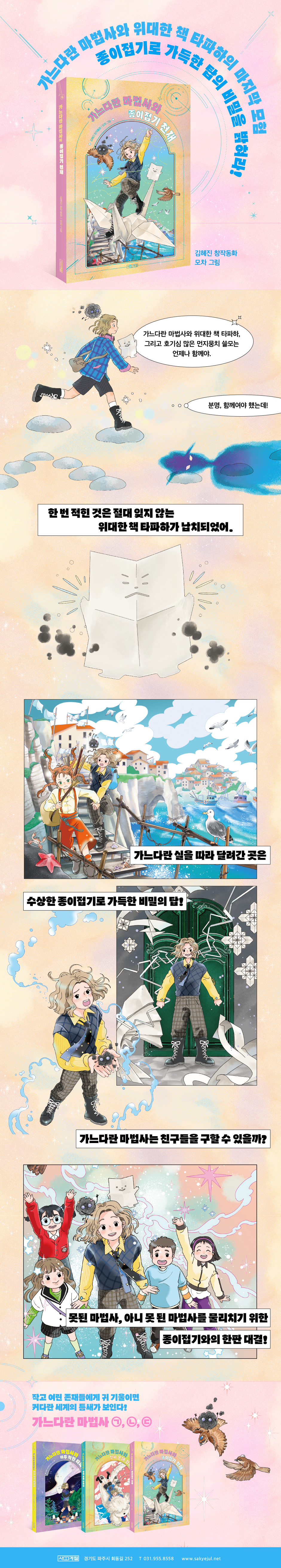 방앗간 3층의 ‘갓 졸업한 마법사를 위한 작은 방’에 사는 가느다란 마법사는 머리카락 한 올, 얇은 실, 글자의 획처럼 가늘고 여린 것들로만 마법을 부린다. 그가 지키는 것은 바로 동네와 이웃의 평범한 일상! 너무 사소하다고? 그러나 봄이 되어도 사라지지 않는 서리를 녹이고, 걱정 많은 아이의 마음속을 살살 빗질하는 가느다란 마법사는 작은 열쇠가 커다란 문을 열듯, 어린이 독자에게 새로운 마법 세계를 활짝 열었다. 그리고 마침내 <가느다란 마법사> 시리즈 세 번째 이야기이자 완결편 『㉢ 가느다란 마법사와 종이접기 천재』가 출간된다.