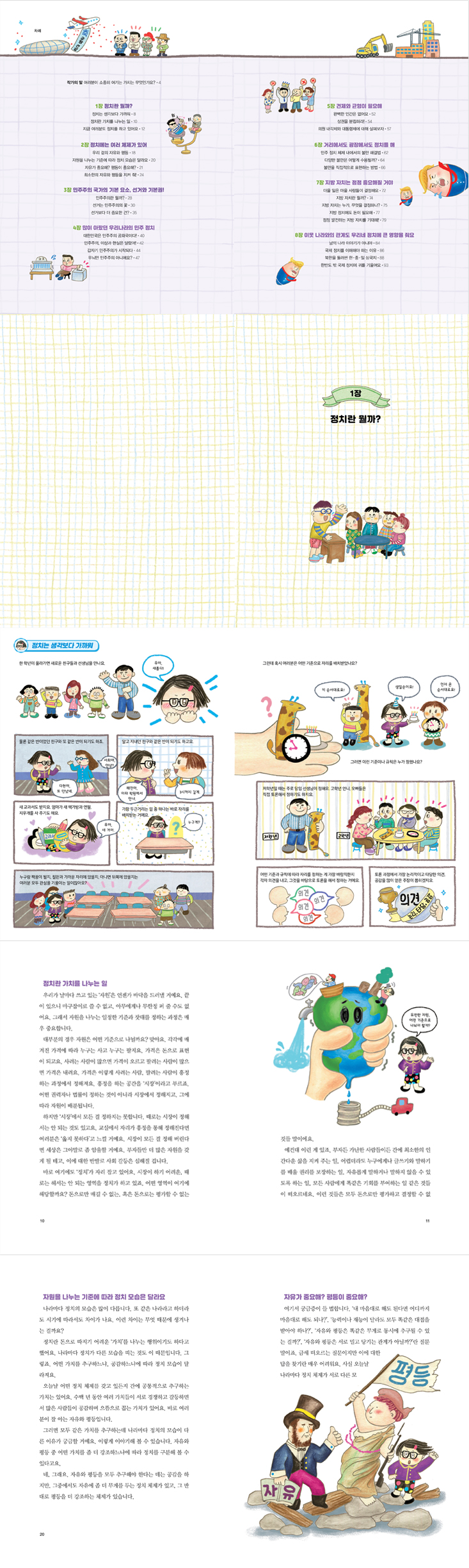 This is an introductory book to politics written by a reporter for children. The writer has explained the politics in our daily life for elementary school children. Why do we have to know about politics? What kinds of impacts does politics create? What relationship does politics have with our own life? This book has easily explained the answers for all these questions and expanded its boundary to real-life politics and history based on Korea’s situation. Therefore, children can naturally be interested in our politics history as well. Moreover, witty and cheerful characters are the ones explaining the politics happening in school life, so children will not feel burdened at all that the politics is difficult and boring.
