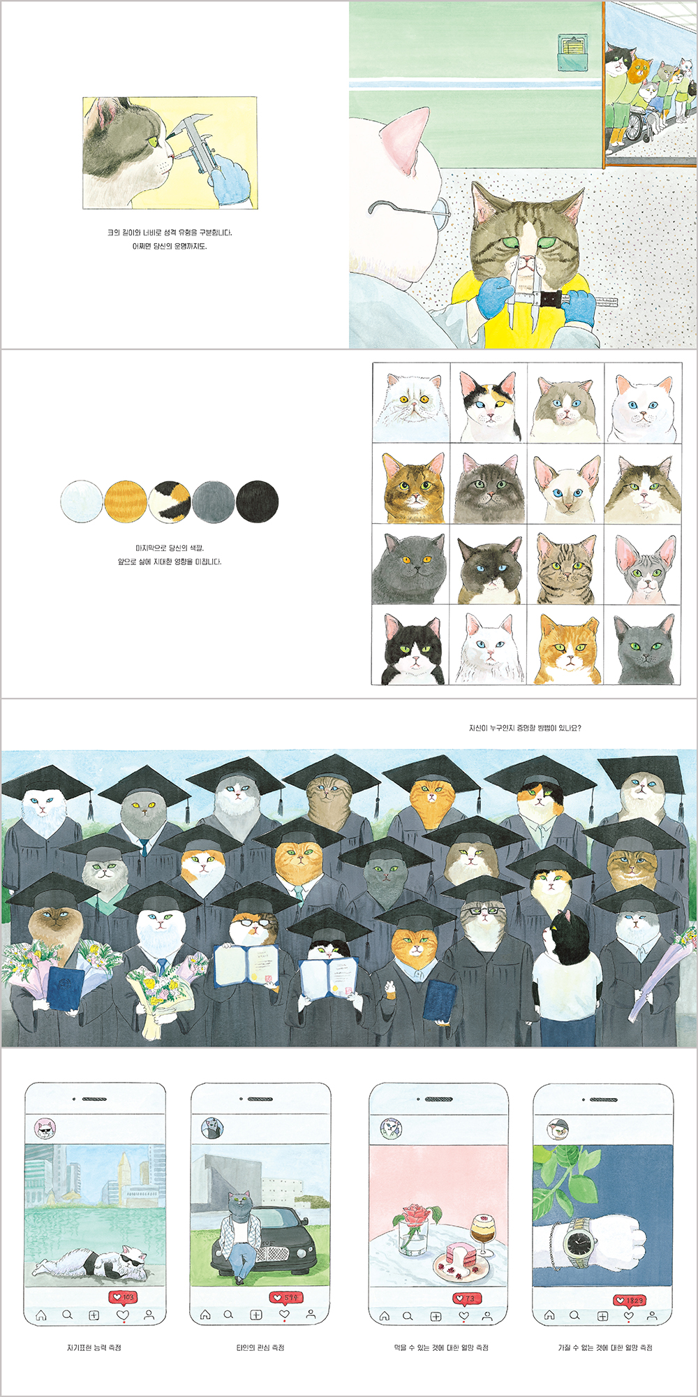 In this picture book, the main character of measurement is a cat. The cat performs measurements at the basic, advanced, and synthesis levels. Cats are depicted as both experiencing measurement and being measured. In a scene from Basic Measurement, we show cute faces of cats with different fur colors and tell them that your color has a significant impact on your life. At first glance, it's hard to see how the color of a cat's fur could have a significant impact on its life, but then you put a person of a different color in the cat's place. Once you've switched the cat and the human, you're reminded of the everyday human behaviors to express kindness that are based on the cat's color.