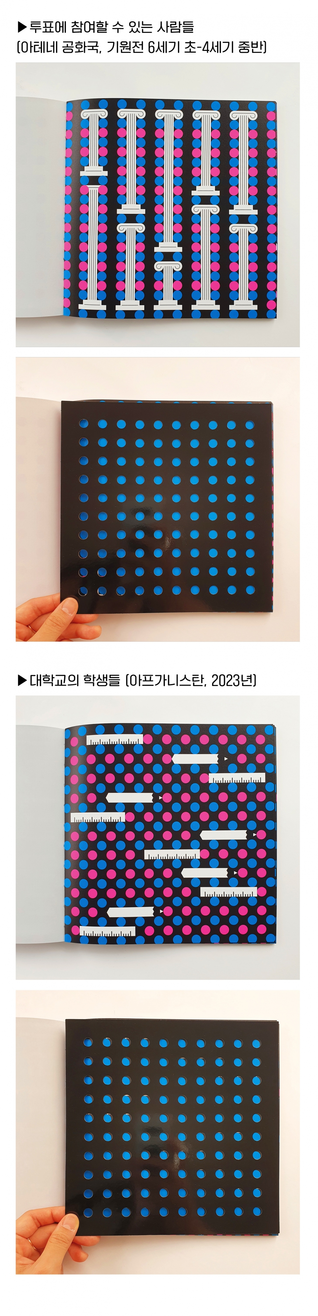 From the cover page, the curious symbol “%” is used to represent the ratio of pink to blue dots. This picture book illustrates the concept of percent with 100 dots to help children readers understand. However, the dots are not easily visible. A perforated plate with 100 holes in it must be held over the image of a harmonious mix of pink and blue to reveal the dots. The dots reveal the positions of women and men throughout the ages and across the globe. For example, the people who were faced with witchcraft trial in Europe in the 14th-18th century, people who had the right to vote in Switzerland in 1970, the top 100 CEOs of Korea's largest companies in 2022, and the gender ratio. And then you come face to face with a percentage value that makes your eyes widen in suspicion. The “percent” that can't be averaged screams out the inequalities that permeate each and every aspect of our society.