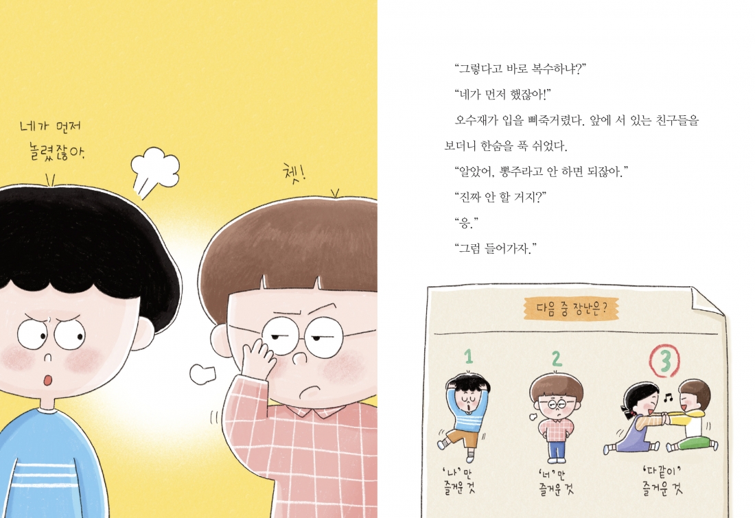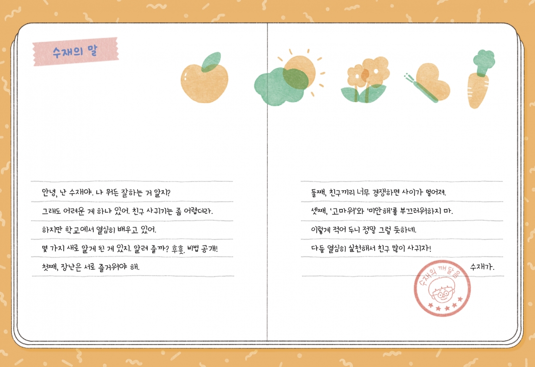 Volume 3 “Wiggly First Graders, We'll Be Good Friends!”, introduces eight basic attitudes that will help first-grade children in their relationships. Don't make fun of your friends/Try not to do it before telling your teacher/Don't hit your friends, even as a joke/Don't compete too much/Be brave to say, “Thank you” and “Sorry”/Don't get annoyed/Accept each other's differences. The teacher has carefully selected the main virtues of relationships that are essential for first graders and has organized them into a story that closely follows the bickering and tumbling of children's lives. Children can read it as if they were reading a fairy tale and enjoy it while also naturally learning how to get along with their friends at school. It has taken the best of nonfiction and fiction.