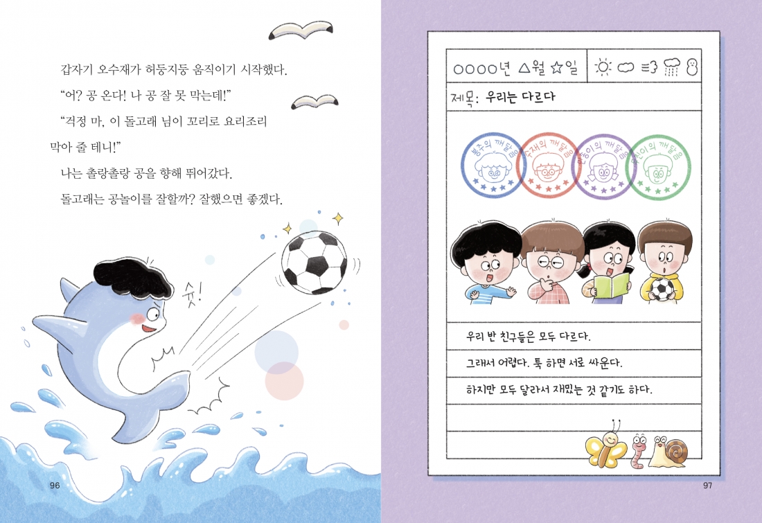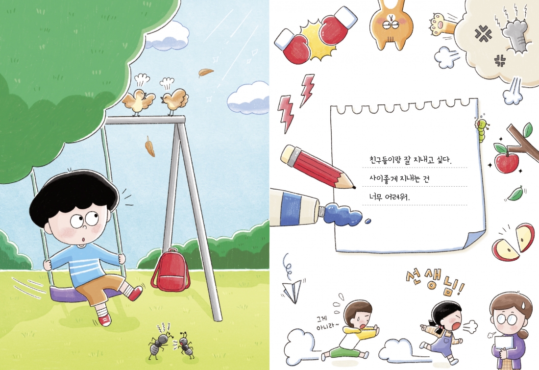 The story of the “Perfect First-Grade Adaptation Project” unfolds through the voice of a first-year student Bong-ju. The story begins with Bong-ju's questions or situations, develops through Bong-ju's narration, and ends with Bong-ju writing her resolutions in her diary. Eight short episodes are collected in one book. The process of Bong-ju's realization while bickering or talking with her friends at school is realistically depicted at the level of a first grader. Teachers and parents, that is, adults, do not intervene. It is ideal for children to read and learn on their own. There are many scenes that cannot be drawn unless you are a teacher who meets children directly, frequently, and for a long time in the field. Bong-ju, Min-song, Soo-jae, and Doo-jin, who are endearingly cute yet incredibly serious, are in the first class of the first grade. You can read about their school life together and get tips on how to adjust to school.
